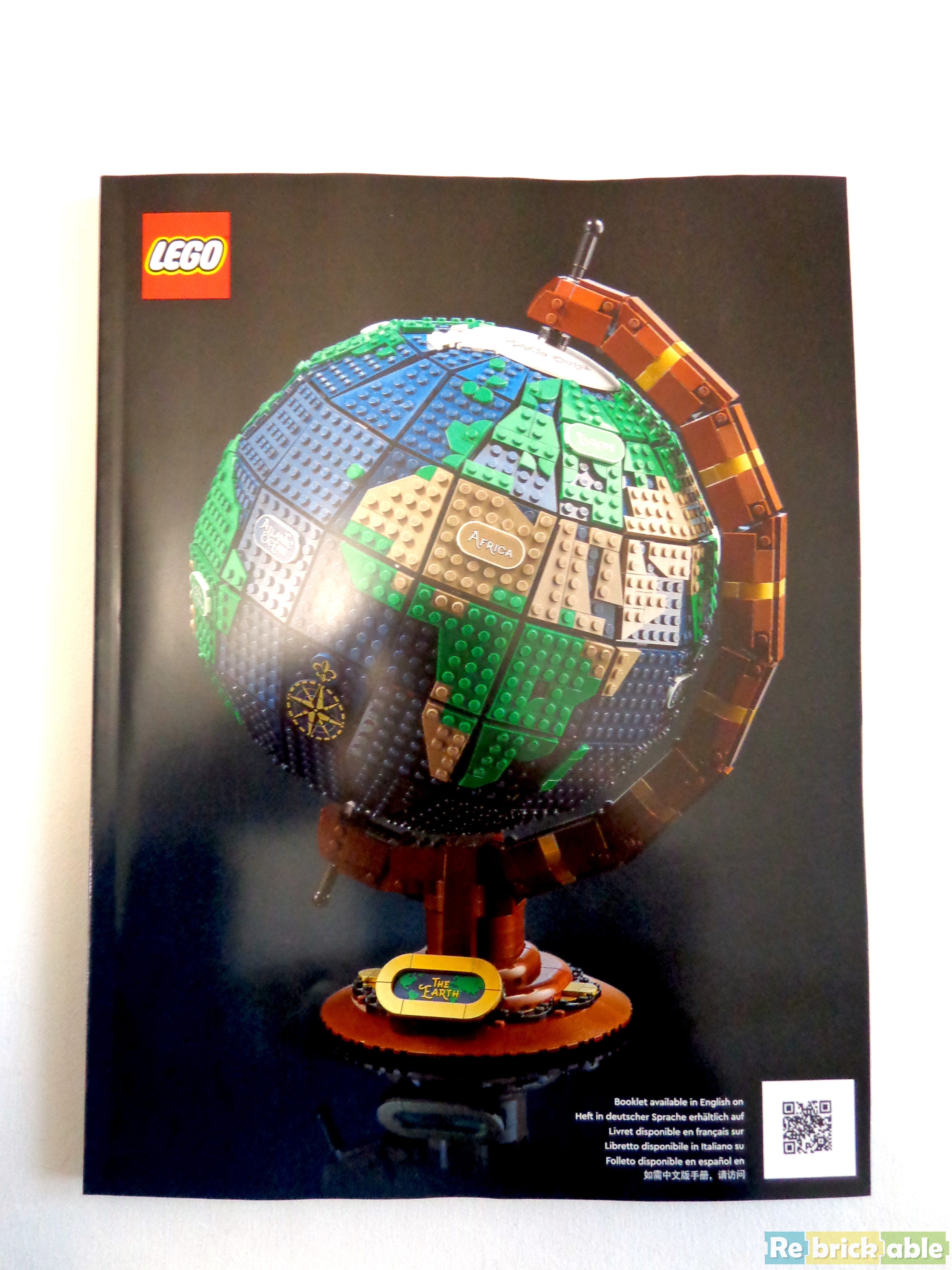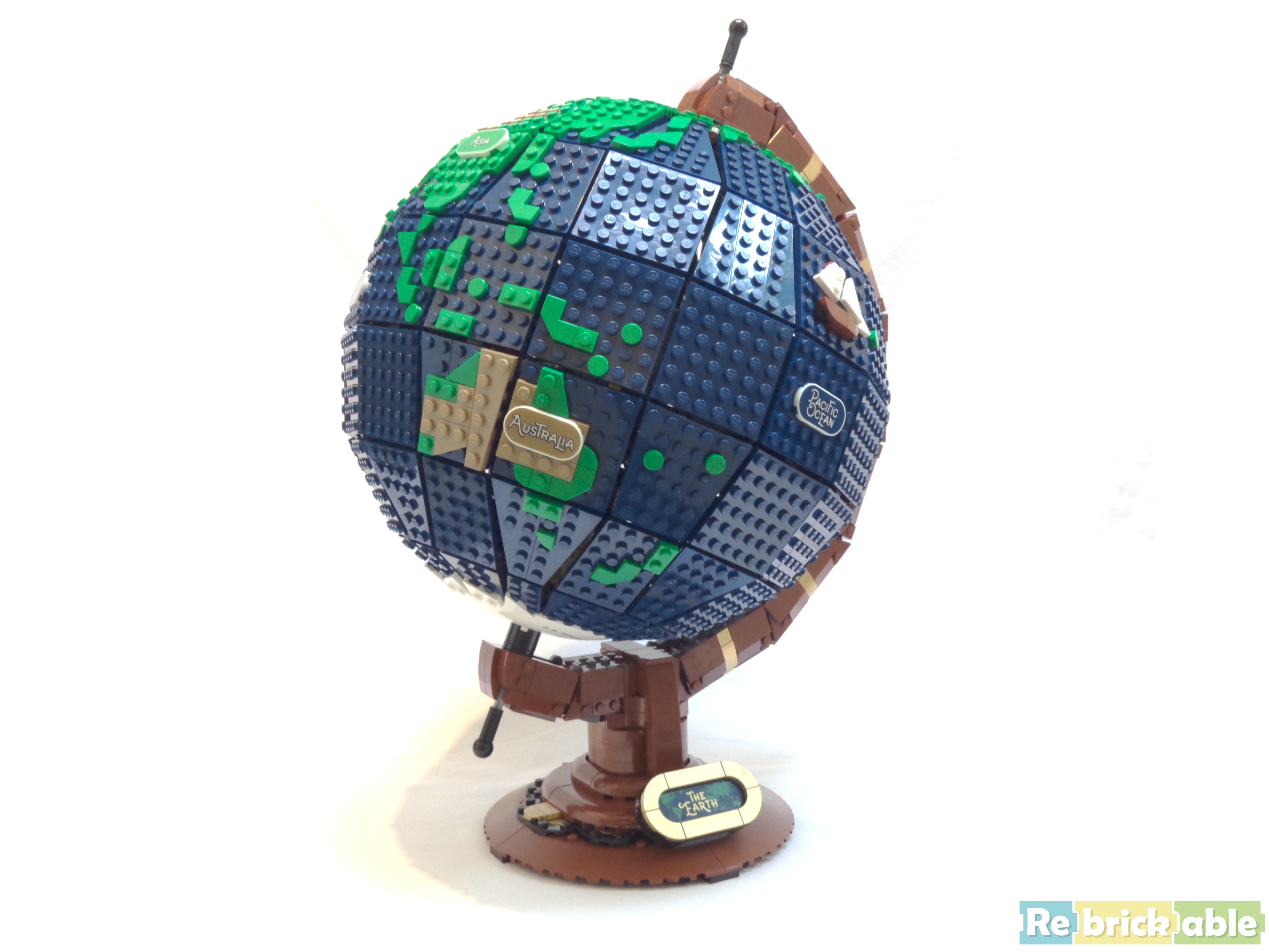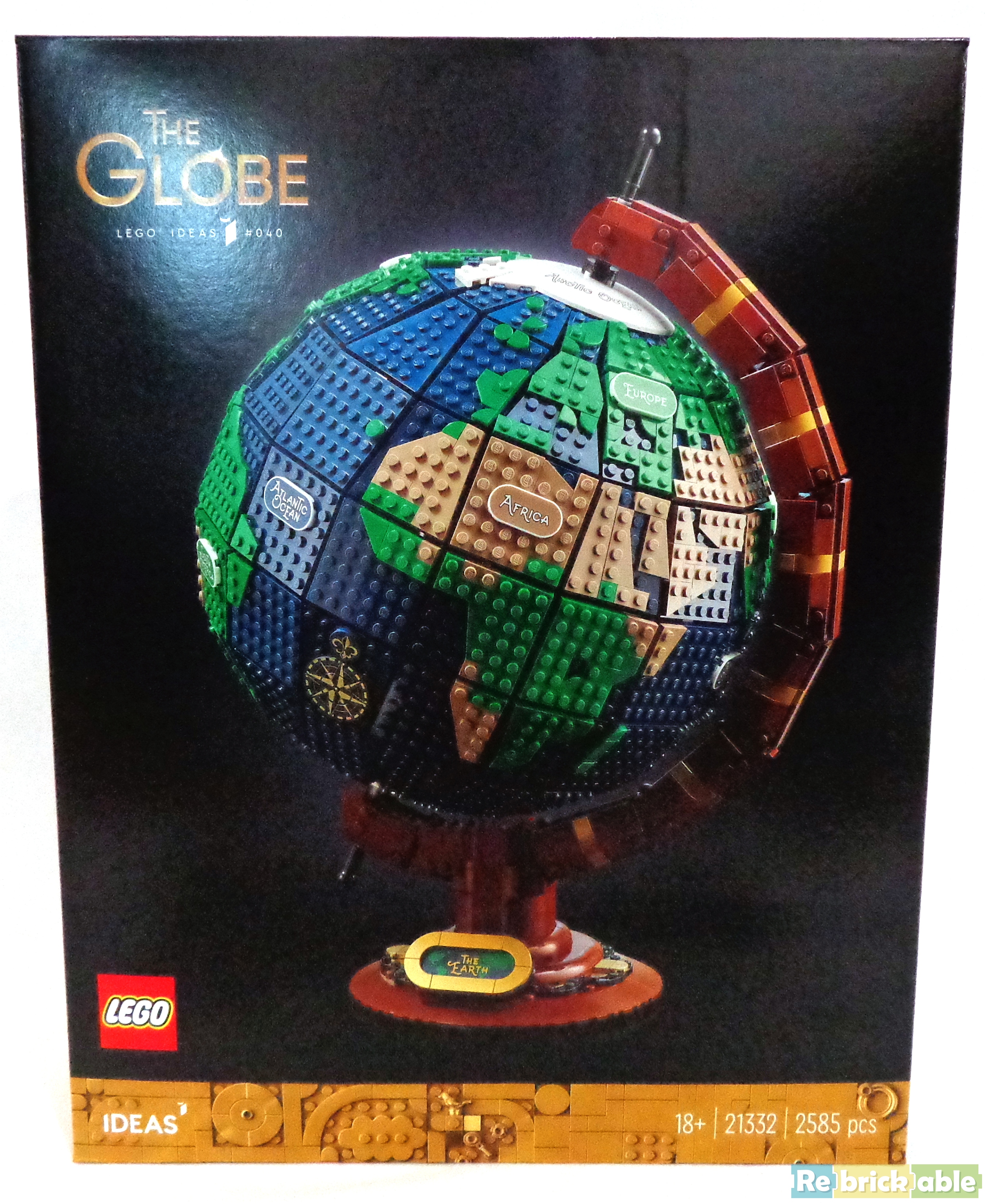 The 2585-piece set beautifully shows a realistic, customizable vintage brick-built earth globe, with printed names of the continents and oceans that glow in the dark so you can display and see the world at every moment. In addition, once built the set spins, a first for a LEGO globe at this scale.