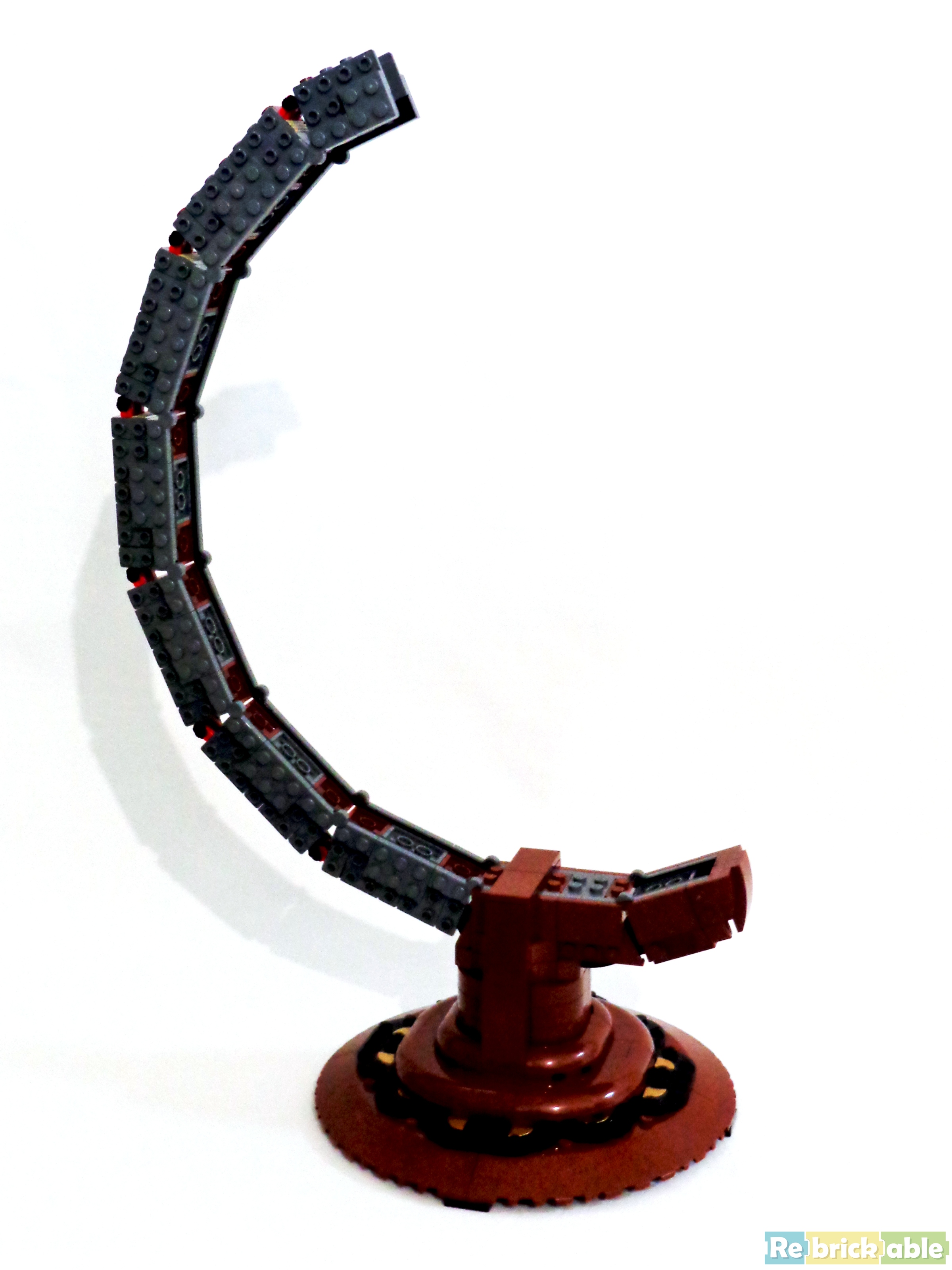 The sixteenth and last bag give us the parts needed for both poles and to set the sphere up on the support. When both poles' parts are in place, you can't put the build on your building surface without a risk of breaking it, at least partially. You can try to make it lay on one of the four equator's assemblies linked to the hub, but not for a long time. I found the step where you insert the axle into the support quite difficult, you can make it easier by removing some of the parts added page 40 (steps 59-60). We finish the build by adding some parts to the base of the support and the label including the 2x6 printed tile.