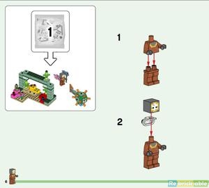 Set 21180-1 The Guardian Battle involves a diver with some weird pets and spiky blow-fishes? With the youngling''s help, I figured out that it''s possible to swim underwater in Minecraft, where there are some mobs to find. Mobs, btw, is short for Mobile Entity, meaning it''s an NPC (non-playable character) that moves around. The 3 weird pets swimming around are called Axolotls. They swim around and attack other underwater-mobs, but are non-harmful to players. It''s possible to attach axolotls to a lead, making them serve as sort of a protection against other hostile mobs. Speaking of hostile mobs: the two spiky things are called guardians. The green one with the orange spikes is a ''normal'' guardian, which are found around Ocean Monuments. These monuments are underwater-structures where you can find rare sponges. The guardians, well, guard these structures. The tan version is an Elder Guardian, a stronger variant which only appears in Minecraft Dungeons, an RPG game taking place in the Minecraft universe. Last up is the blue thing: Glow Squid, a passive mob that sometimes gives glowing ink when killed.