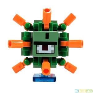 Set 21180-1 The Guardian Battle involves a diver with some weird pets and spiky blow-fishes? With the youngling's help, I figured out that it's possible to swim underwater in Minecraft, where there are some mobs to find. Mobs, btw, is short for Mobile Entity, meaning it's an NPC (non-playable character) that moves around. The 3 weird pets swimming around are called Axolotls. They swim around and attack other underwater-mobs, but are non-harmful to players. It's possible to attach axolotls to a lead, making them serve as sort of a protection against other hostile mobs. Speaking of hostile mobs: the two spiky things are called guardians. The green one with the orange spikes is a 'normal' guardian, which are found around Ocean Monuments. These monuments are underwater-structures where you can find rare sponges. The guardians, well, guard these structures. The tan version is an Elder Guardian, a stronger variant which only appears in Minecraft Dungeons, an RPG game taking place in the Minecraft universe. Last up is the blue thing: Glow Squid, a passive mob that sometimes gives glowing ink when killed.