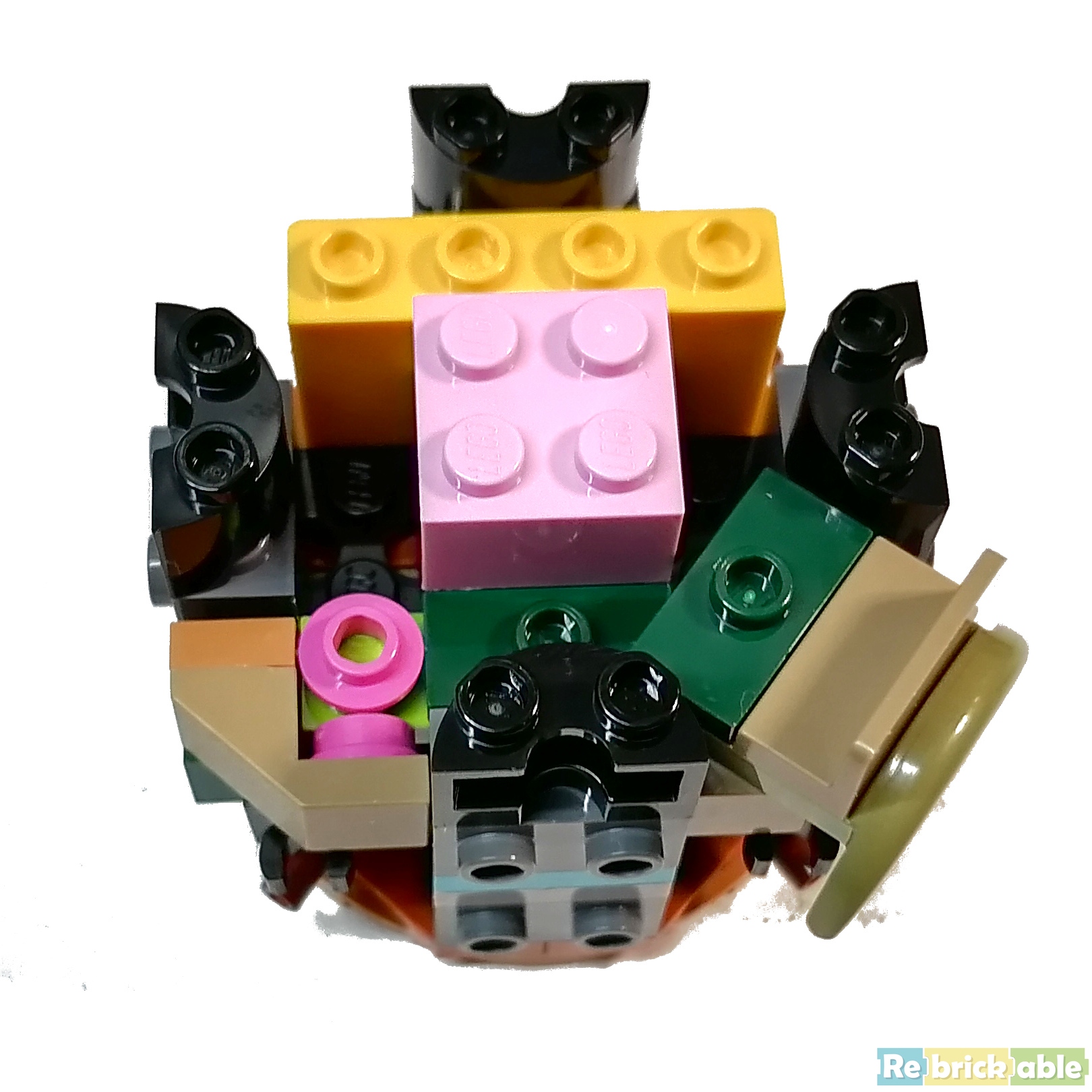 Then we come to stage 3, that builds the head. This is where things get interesting. The center of the head is a mess of SNOT, bars and pins. On this center, the exterior is placed in separate sections. I love the part usage here: to fit the bracket, the part underneath needs to be a tile. Since it's Groot, the designer decided to go with a wood-print for the tile, despite the part getting completely covered up out of sight.