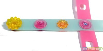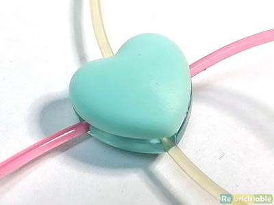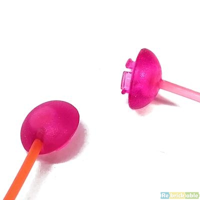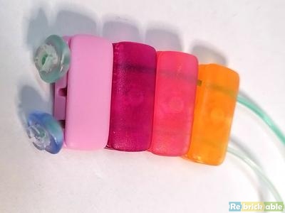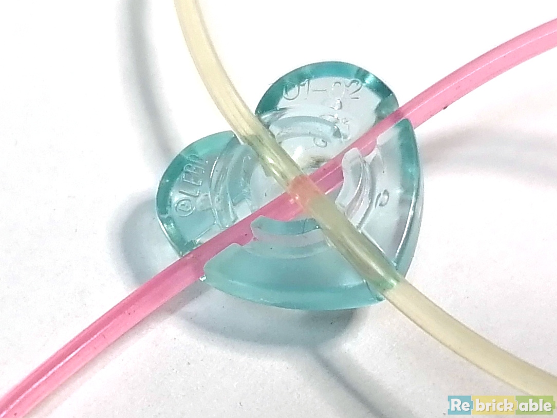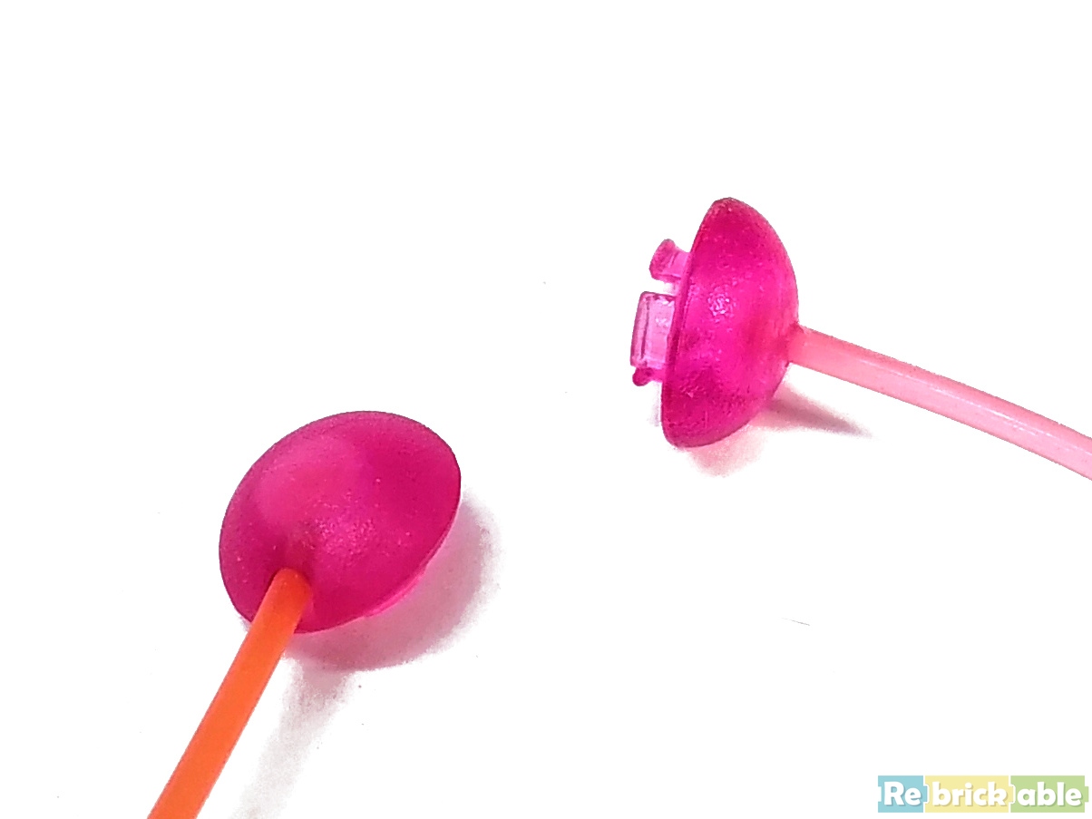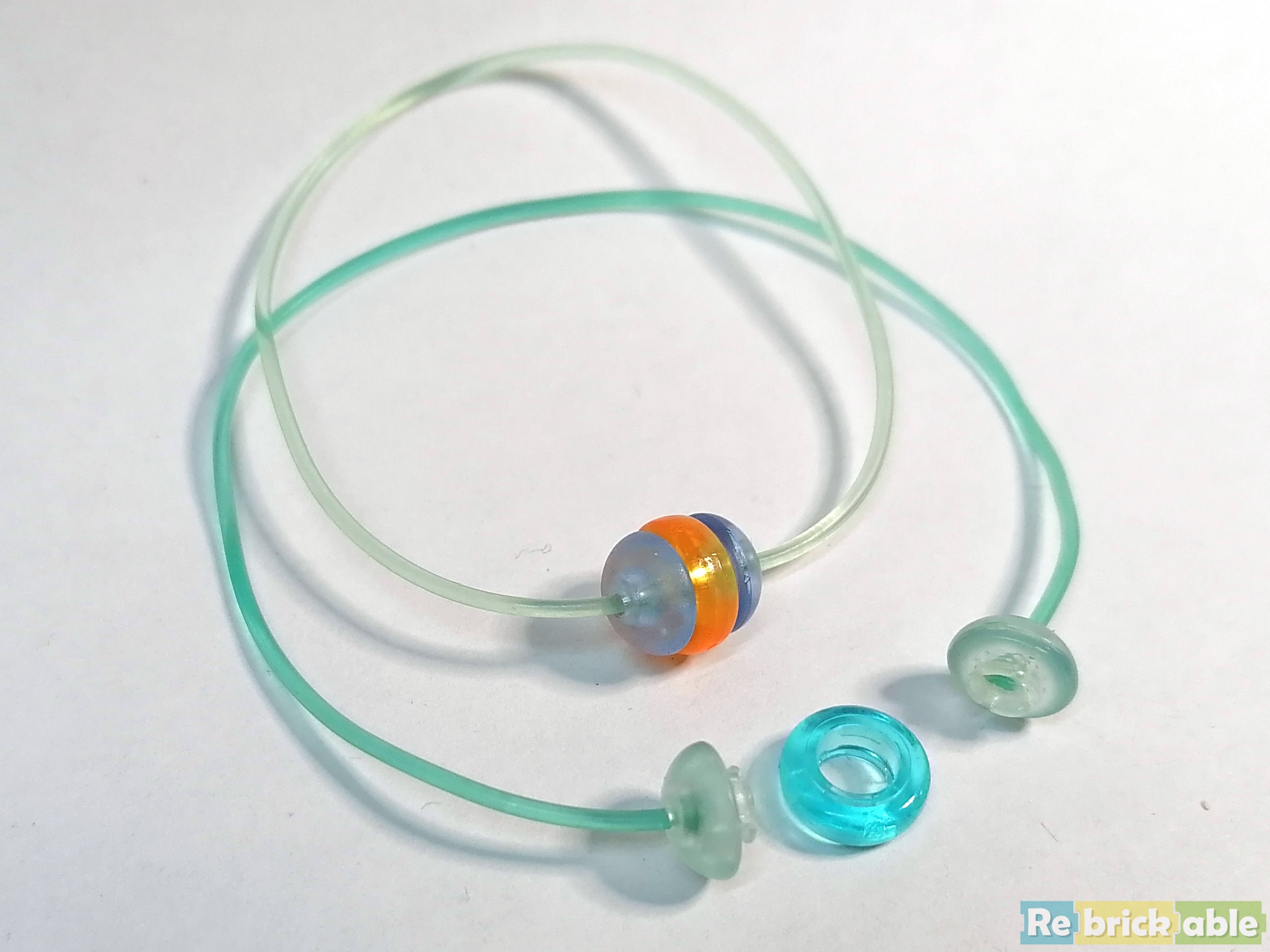 As you might have noticed, besides a pin or a hole, there are also grooves underneath the Icons. These make it possible to connect them to strings. There are 2 types of string: Jelly String, which is rigid, and elastic string. The elastic strings in my lot were all gone brittle, so I can't show them. They are basically thin rubber bands. The Jelly String has on each end a cap with a Pin. Using a Thick Ring, you can connect the 2 ends to form a closed loop.
