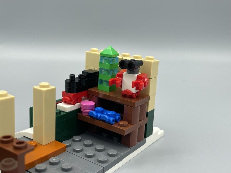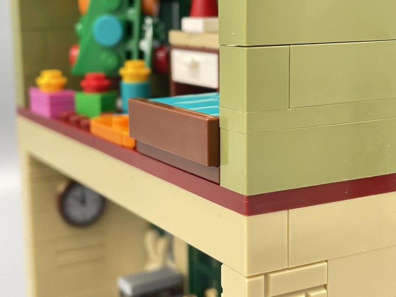 The last building has all the same issues as the music shop, however it does do a better job of being more interesting. Here's where the micro-build toys are, the obligatory train, some kind of tower, and is that Zobo?. Upstairs there's a cute bedside Christmas tree with gifts. The bed is actually a really nice design however the lack of internal space means it sticks out the building, something which I don't think is ok. Here we get a flat roof which is painfully empty. There's a great opportunity here to add a small detail, like a plate with reindeer food, or a Santa stop here sign. Anything really. Outside though is probably my highlight of the set. I absolutely love the garland which stretches across the entire facade and will probably be utilizing this design to add more to other Winter Village buildings.