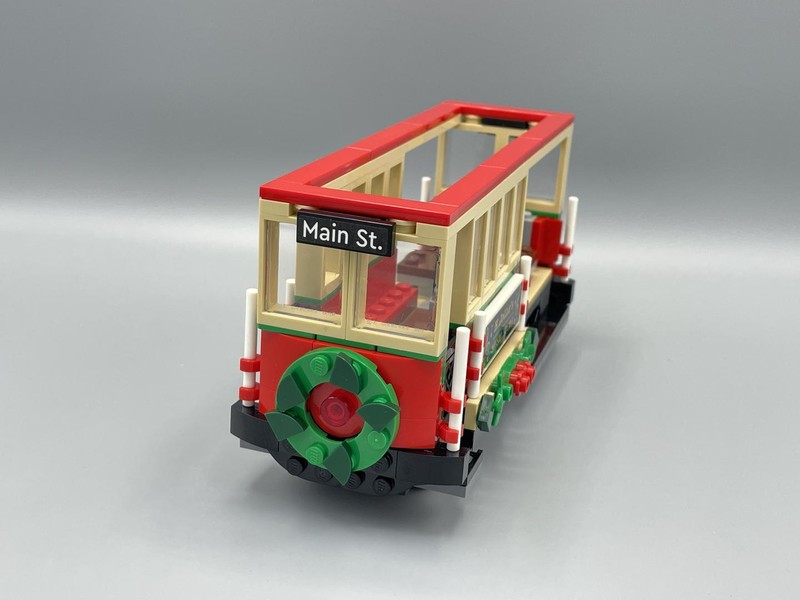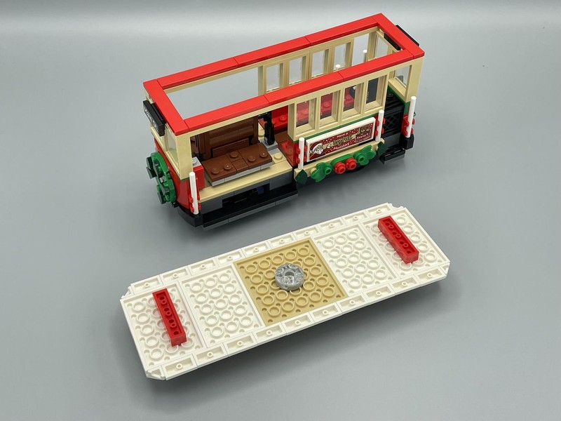 The roof hides some parts that are needed if you choose to motorize it. Unfortunately I'm currently going through some extensive construction at my home so I don't have access to my LEGO collection to show you how it looks with the electronics on board. Essentially the hub/battery box is placed in the area behind the windows. The option to include part 22168 Light Unit, LED, with Cable also gives the tram a headlight and brake light. I have seen images of it built with the Powered Up elements and I have to say I think it makes the tram look kind of ugly. The hub is very visible through the windows so I'm unlikely to include a motorized version in future Winter Village displays.
