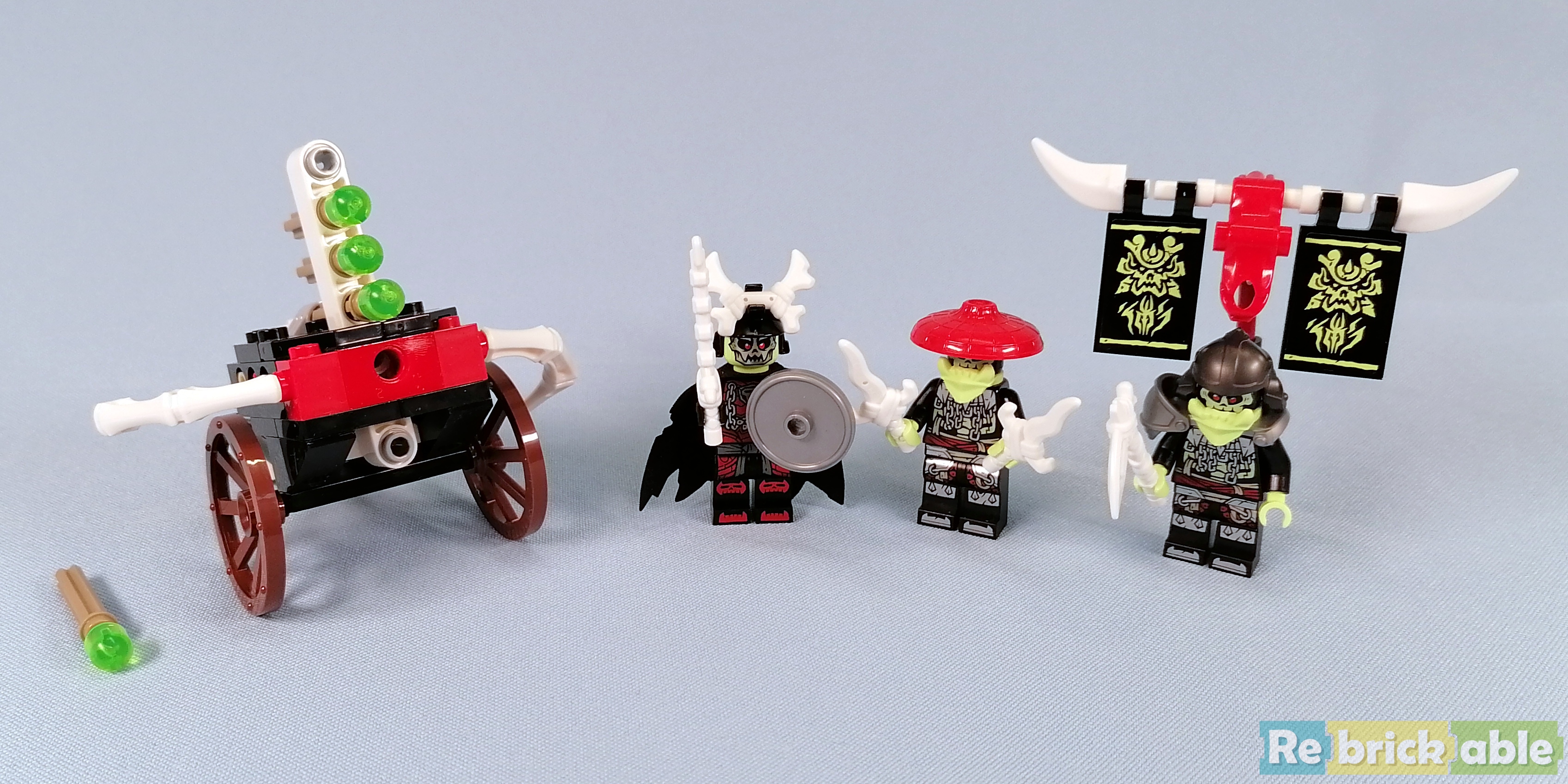 5 minifigures for epic battles This cool toy playset for kids includes 5 minifigures: ninja warriors Jay and Nya, who are each armed with a sword, and green bone warriors Bone King, Bone Knight and Bone Hunter, who have their own weapons from the green bone warrior assorted weapons pack, plus a fast-firing double crossbow loaded with 4 darts and mounted on a wagon. There is also a Pixal Bot.