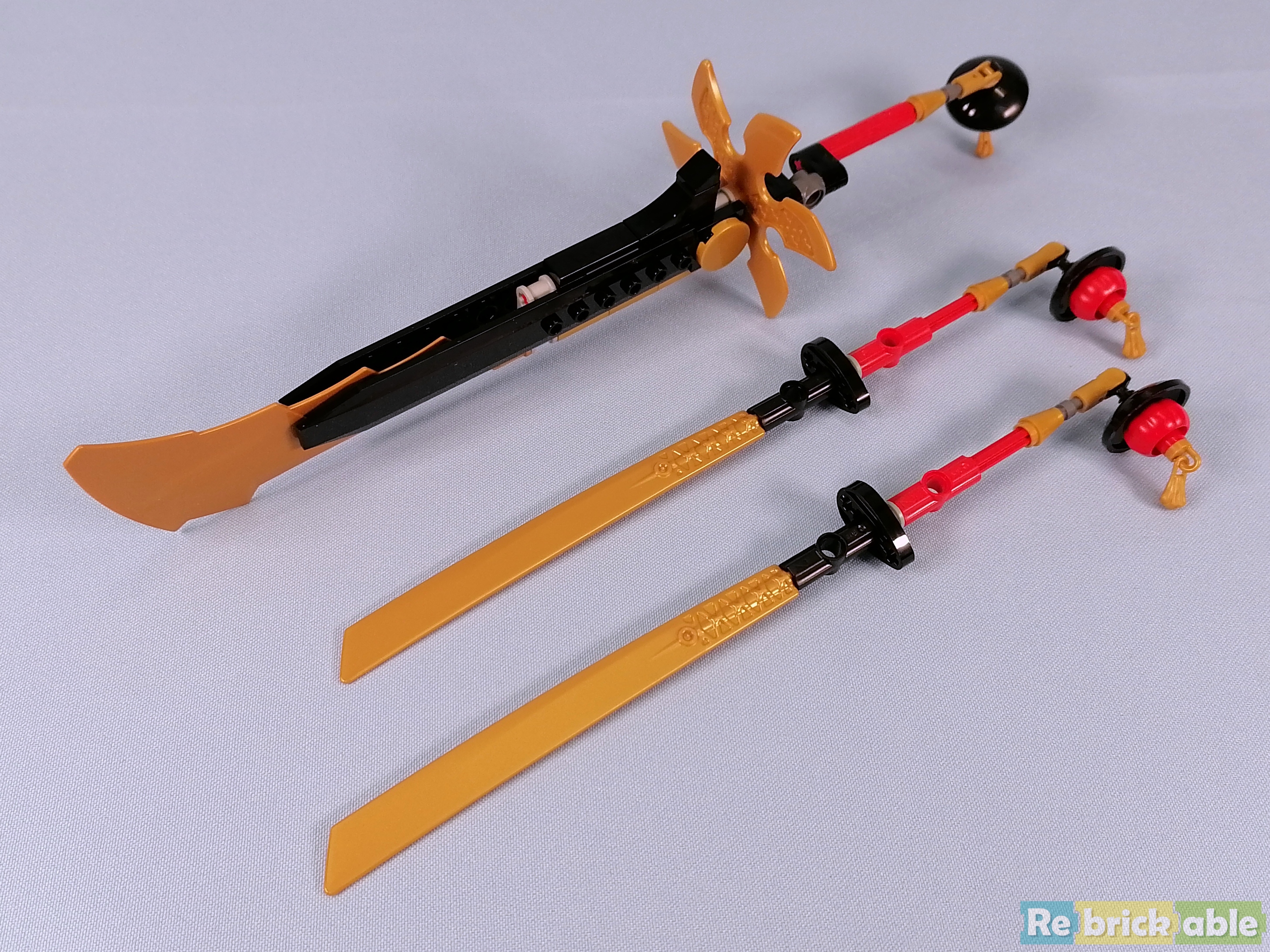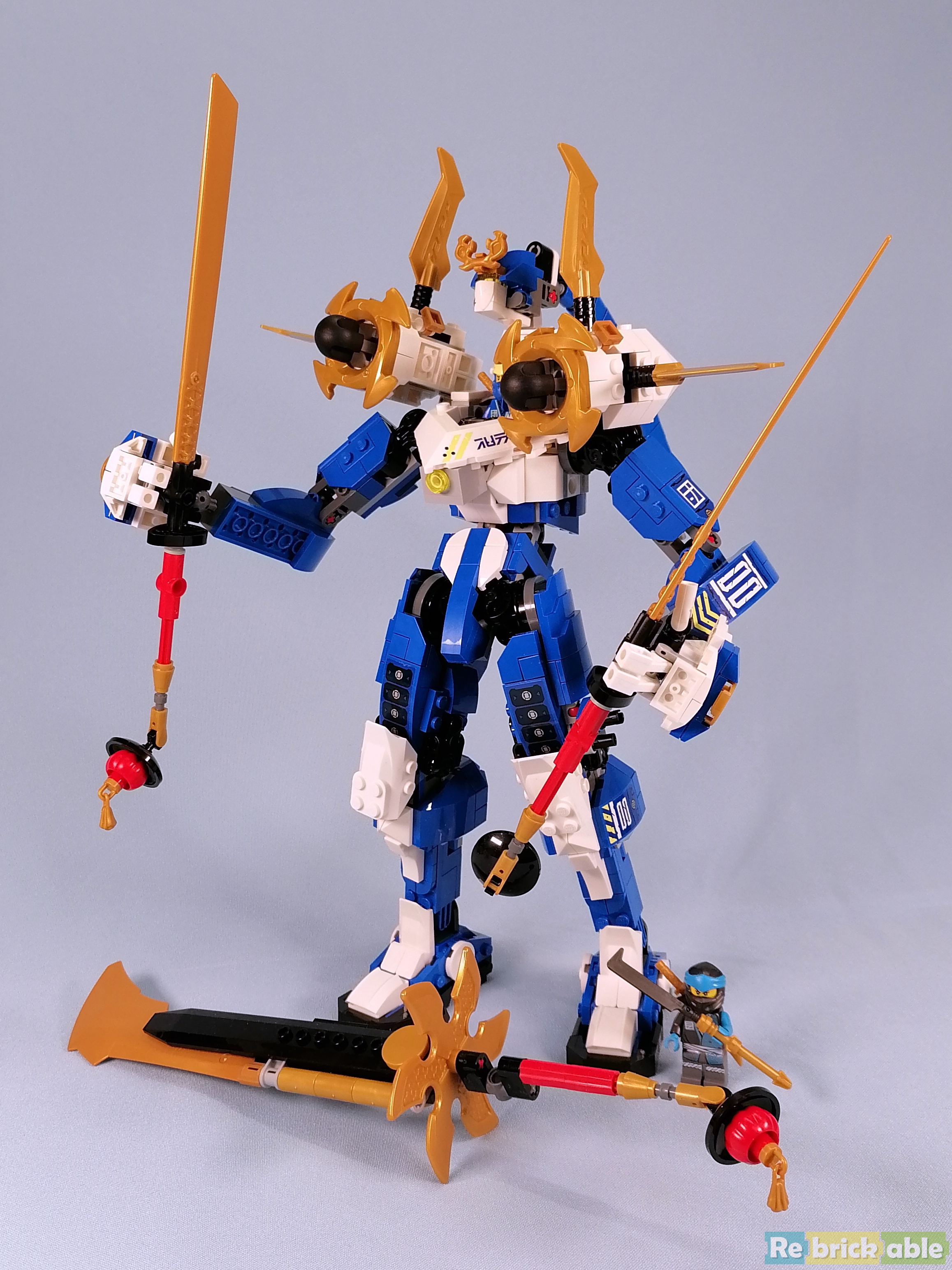 And more weaponry is added in the form of huge swords. The smaller two can connect to the knee of the mech when not in use. Inside the hands are pins to make the mech hold the weapons. And with that, the mech is finished!