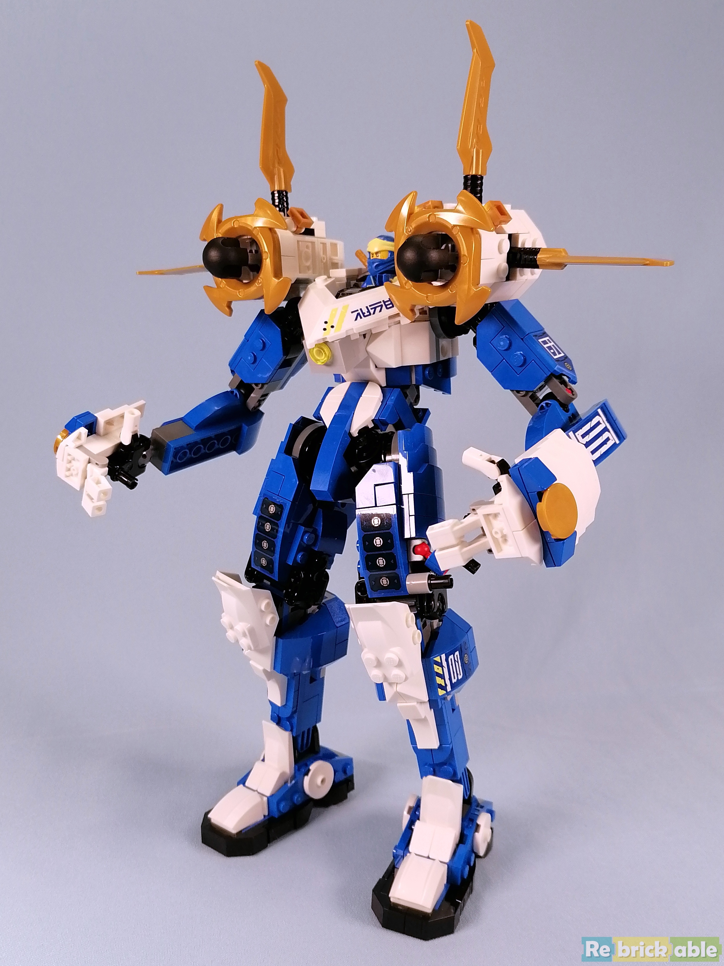 This is truly bad-**s model. This is the first large Ninjago mech I've built, and I'm not disappointed. The size surprised me a bit. The limbs are sleek, making it look a lot smaller in photos, but next to a minifig you can see the true size better. The mech has a lot of joints, with moving hips, knees, feet, shoulders, elbows and hands. But while the arms have a lot of positions they can be placed in, the legs are less flexible. The knees can hinge backwards, but because the feet have less range, the mech can't really kneel, only squat a bit. You could make it sit though. The knee-hinges are a standard ball-joint, and I noticed it didn't always hold very well, especially when the whole mech rests on it. The arms and hips don't have this problem.