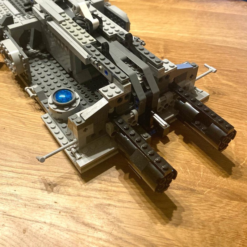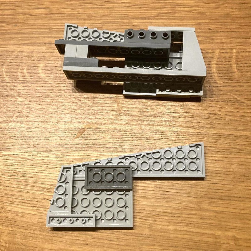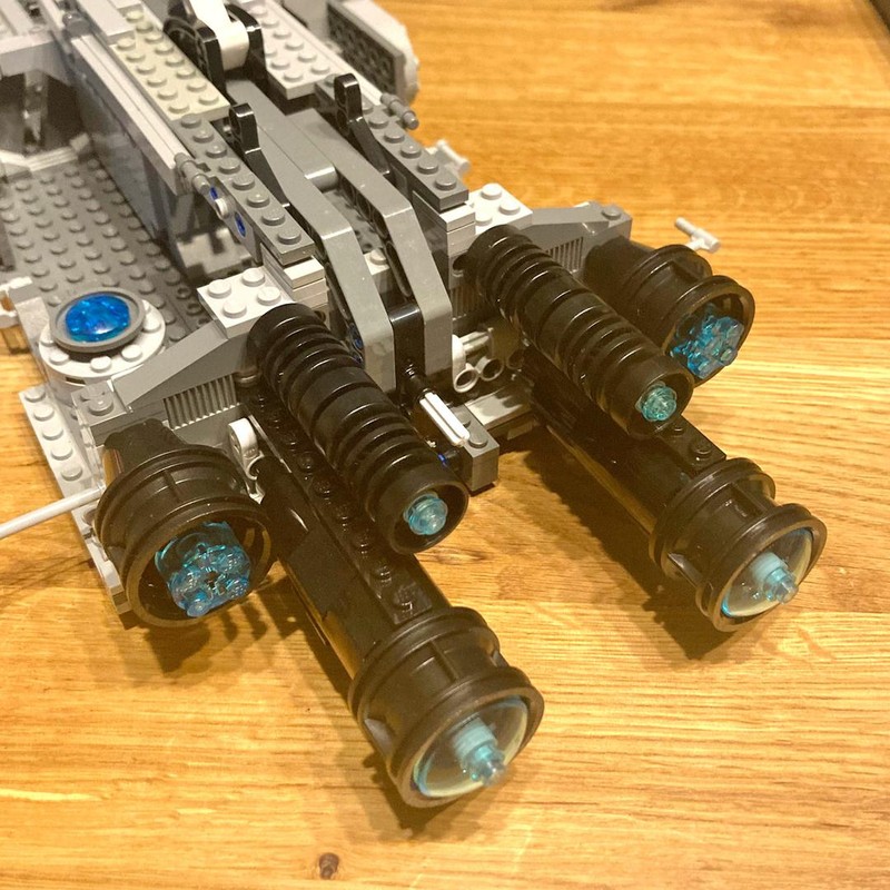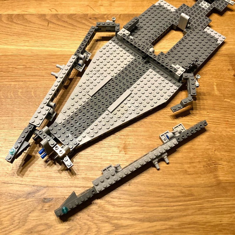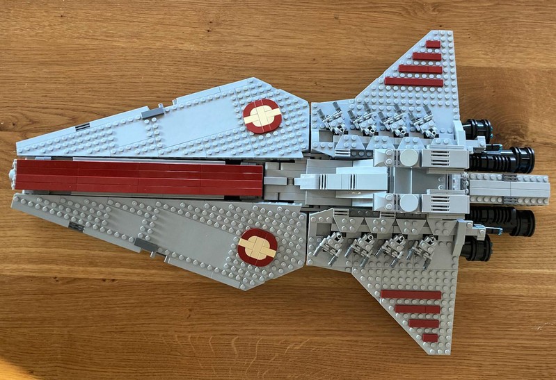 The model of the Venator looks great. The overall shape is very precise. One might argue that its a bit too high, but in my eyes that's no issue. The bridges with tower, turbo lasers and engines are very well built. The wheels on the engines add great detail/structure. When you look at the model you notice overall a few visible gaps, i.e. next to the hangar doors and next to the engines. But with this model it doesn't bother me that much, because when you have the model before you, it is quite clear that most of the gaps can be easily filled without changing to much on the MOC. For example in the last picture I filled the gaps on the hangar doors with some plates with door rail and they are nearly gone. Same goes for the big gaps next to the engines: you can easily fill them with a few plate or inverted slopes to maintain the folded look. Last but not least, if you like more greebling the sides of the ship offer lots of space to add some, i.e. by using the exposed technic bricks. There are some more little things I was thinking about changing while building, but they don't bother me with the finished model despite I still see them. I think that's one great thing about LEGO, that you can look and improve a model to your liking and have fun while doing that. So this one will keep my busy for a while (in the best way).