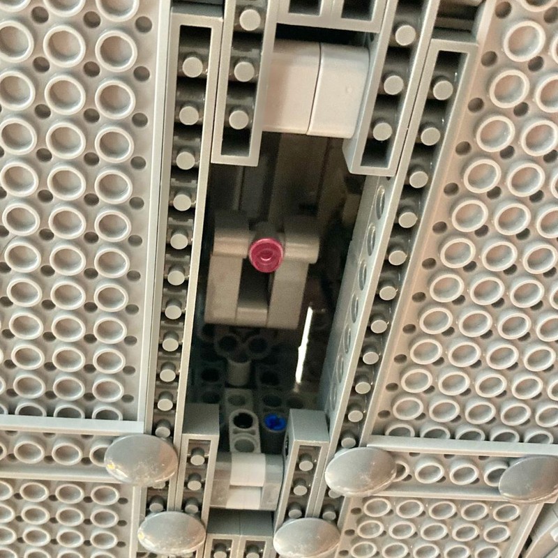 After that we continue with the rest of the hull to give the Venator its iconic shape. The folding mechanism on the top hull makes (again) great use of plates with pinhole and creates enough space for the movement to open the hull independently from the hangar doors. This MOC shares this feature with the beforementioned Star Destroyers but the designer came up with an own technique, that creates the space between top and lower hull to leave space for the cannons. While building the hull sections next to the tower you might recognize a fun play features, that was to km knowledge introduced with the 75055 Star Destroyer: rotating turbolaser turrets. The sliding section doubles as a small fourth engine.