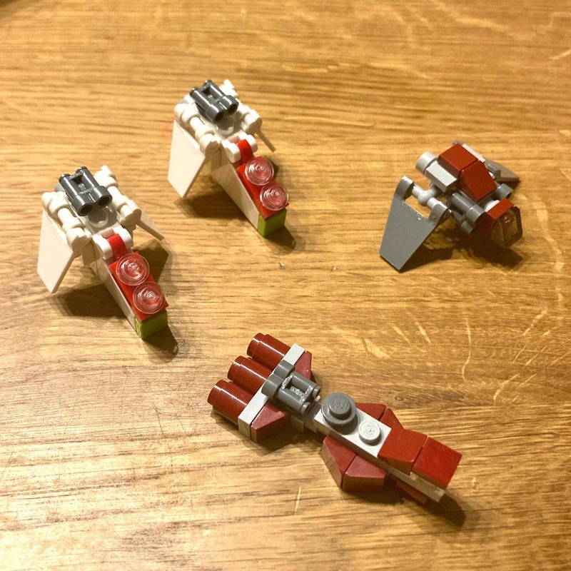 At the bottom of this section we place two small panels with some greebling to cover the gaps next to the engines and the docking bays at the side. The needed 45 degree angle is built with two plates with bottom pin. This needs to be connected carefully because the distance between the two counterparts is about one millimeter wider, but once connected it doesn't seem to have a lot of tension on the parts. Interestingly this section is hold just by one clip and a second clip out inside a locking hinge keeps it from moving around. This way those sections can easily be detached to get acces to the interior. Last but not least we build the front sections with a lot of wedge plates of the hull and the Venator is finished. As bonus the designer gives us four micro ships (which are included in the inventory), that fit in the hangar space. If you watch the promotion video mindfully, you can spot a micro Y-wing. They resemble (two) republic Gunships (LAATs), one republic (consular-class) frigate (like this one) and a shuttle, which I think might be a Nu-class transporter.