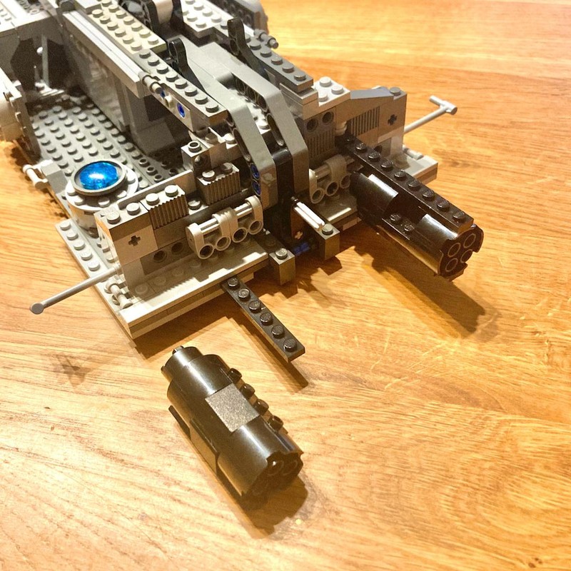 The unquestioned star of this MOC is its fantastic playability. The hangar doors are brilliant and add so much to the playing experience but are also vital for displaying options with some smaller ships deploying. You might never want a Venator without this feature. But that's just the start. The whole hangar area is accessable when folding the hull out. There's room for a lot of microbuilds. As you can see, I found a great dropship with AT-TE from hrodas, that fits the micobuilds of the MOC perfectly. If you want to get more accurate in scale comparison you find also some nice nano builds of those complementary ships here on rebrickable, like those. In the pictures sections of this MOC you find some inspiration for an interior 'upgrade' of the hangar. I'm thinking about adding some smaller bays (like shown here). The MOC shows also great thought by adding a second play area, this time in Minifig scale, in the back of the ship. It has not much interior, but again enough space to add one to your liking, maybe a quarter for the clone troopers, a armory or or or... I want to point out one more great ('hidden') feature: the (accurate) docking bay on the underside of the Venator, that actually can hold the little republic frigate. This one even got nearly forgotten while building because it is encased quite early in the process. Last but not least the very clever build-in handle helps with swooshing around with the ship and aligns wonderfully with the tower, when not needed.