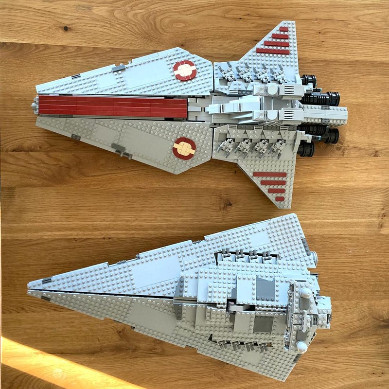 The Venator Star Destroyer is for me and probably many others one of the most favourite vessels from the Star Wars universe. So naturally the just announced huge LEGO UCS version got a lot of attention from AFOLs. But just as me many others may have second thoughts because of the (also) huge price tag of the ships of the UCS-series. On the other hand the playscale version from 2009 wasn''t that good in my opinion (way too thick and the play features are questionable). That was the reason I searched for MOCs that resembles that ship appropriately a few years back.