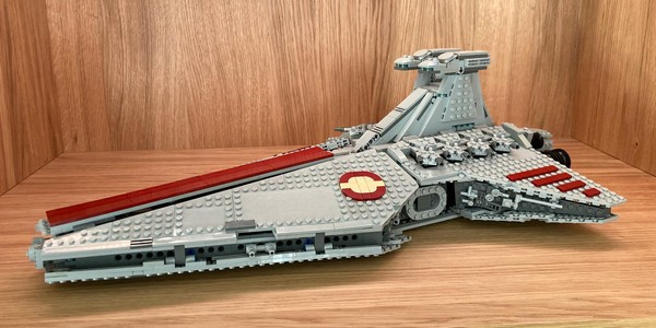 LEGO Star Wars Venator playset scale design! There has been no official LEGO Star Wars Venator playset since the 2009 Venator-class Republic Attack Cruiser 8039. The LEGO community has since designed myriad UCS-scale models. However, no mid-sized designs have been prominently released. This model presents a modern take of the action-packed official 2009 set while employing a more sophisticated construction design evocative of modern LEGO builds. The model’s context centers around the final two episodes of the Star Wars: The Clone Wars animated series.