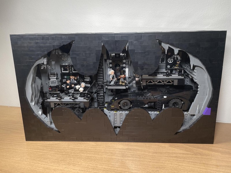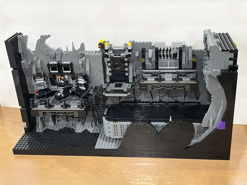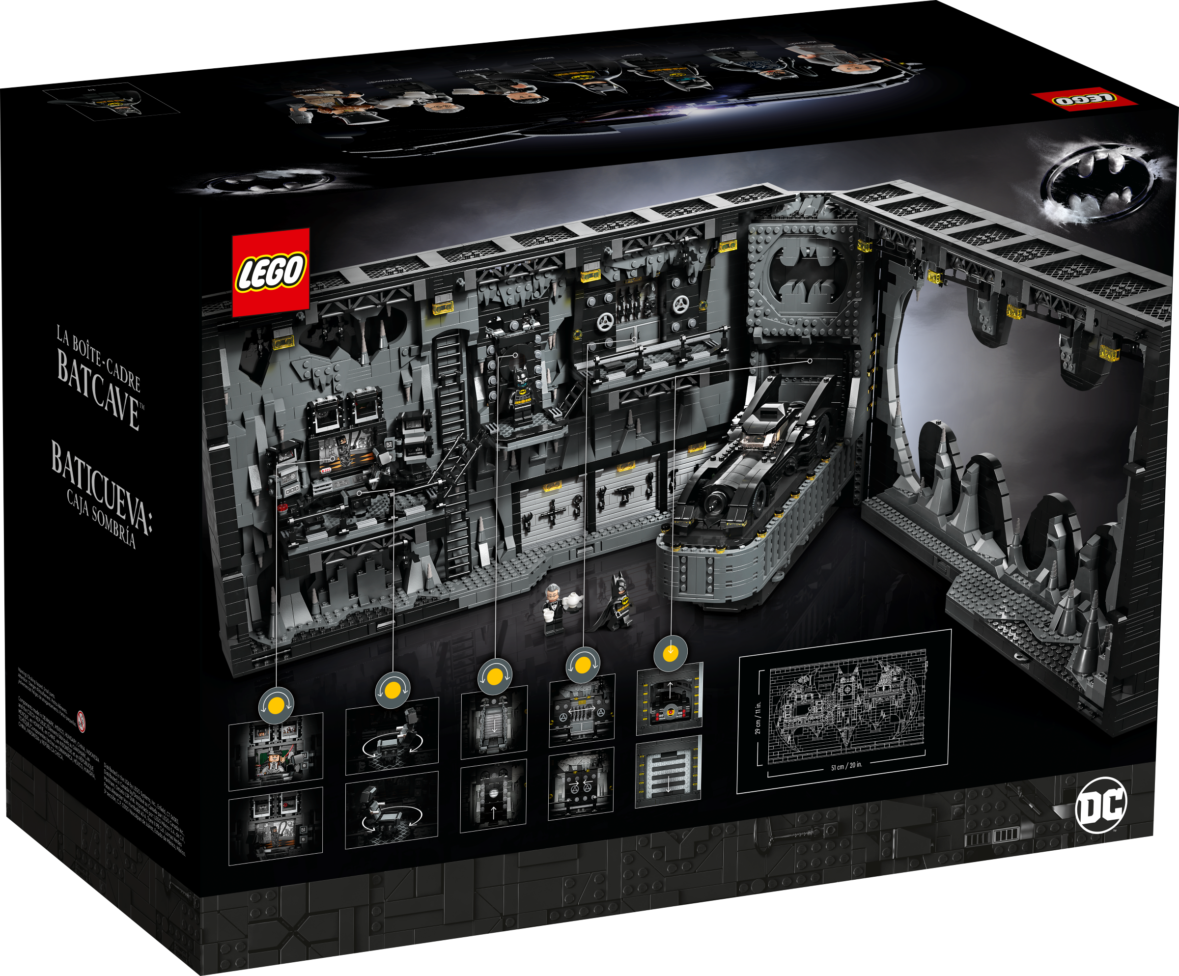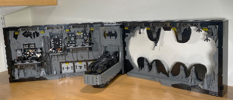 Batman drama in a display case Measuring over 20 in. (51 cm) wide, this Batcave tableau contains an assortment of authentic details, including movable items that can be controlled from the rear. Users can turn the chair, change the computer screen and open and close the tool store and illuminated Batsuit™ vault. For extra realism, a Batmobile with a variety of hands-on features is included along with 7 minifigures: Max Shreck, The Penguin™, Catwoman™, 2 versions of Batman, Alfred Pennyworth™ and Bruce Wayne™.