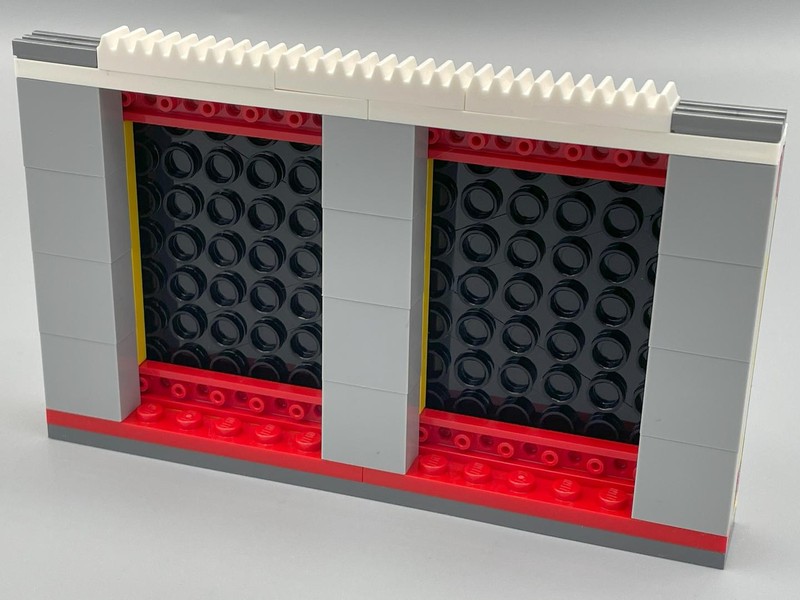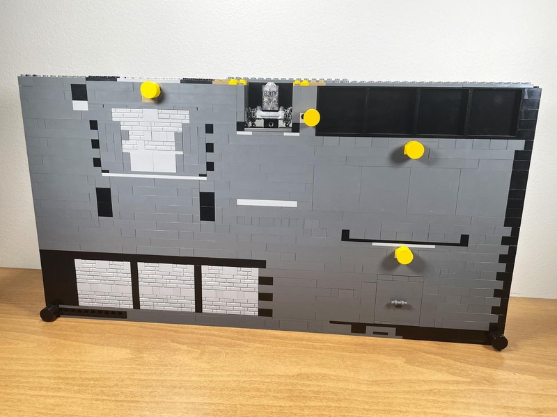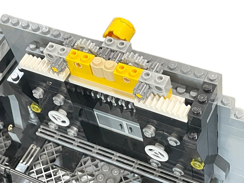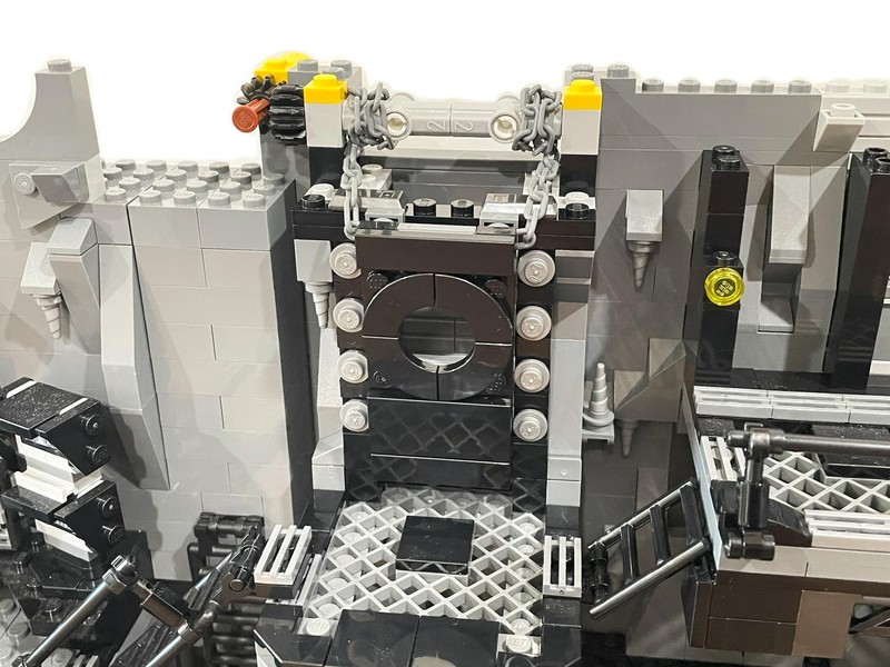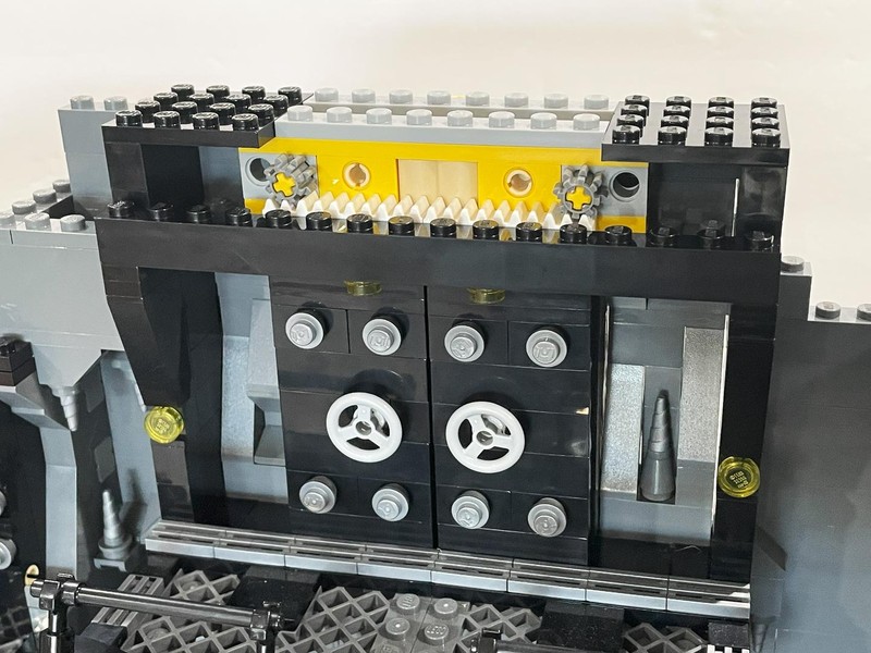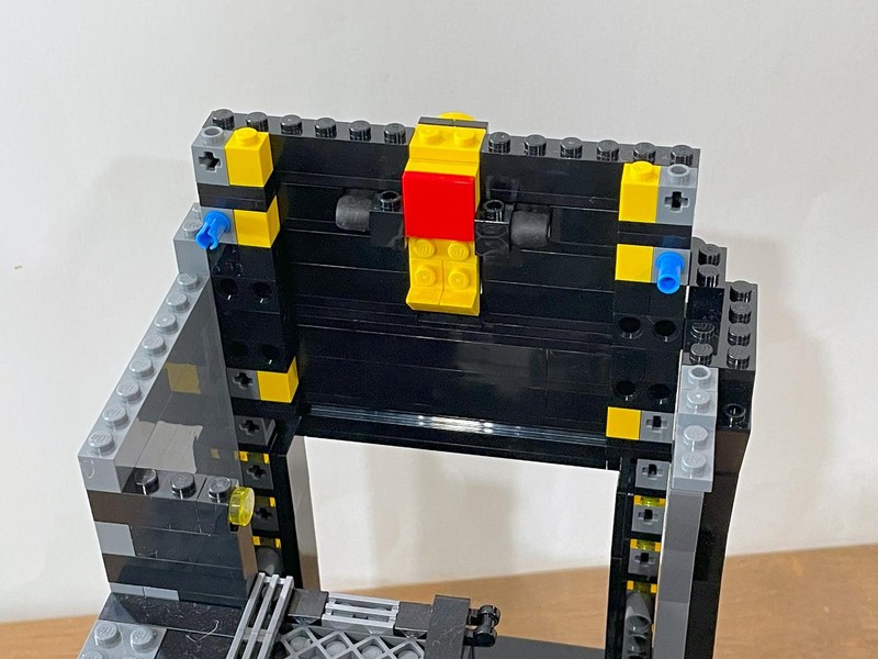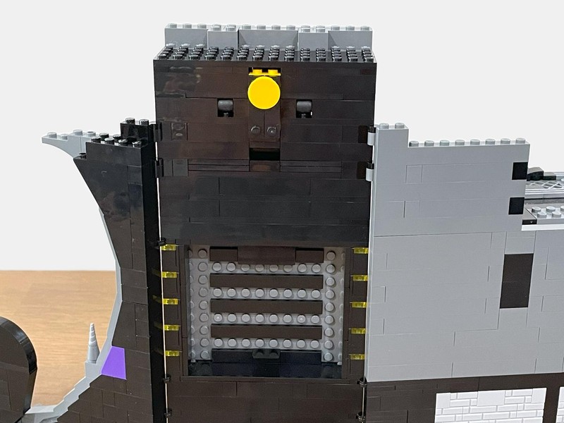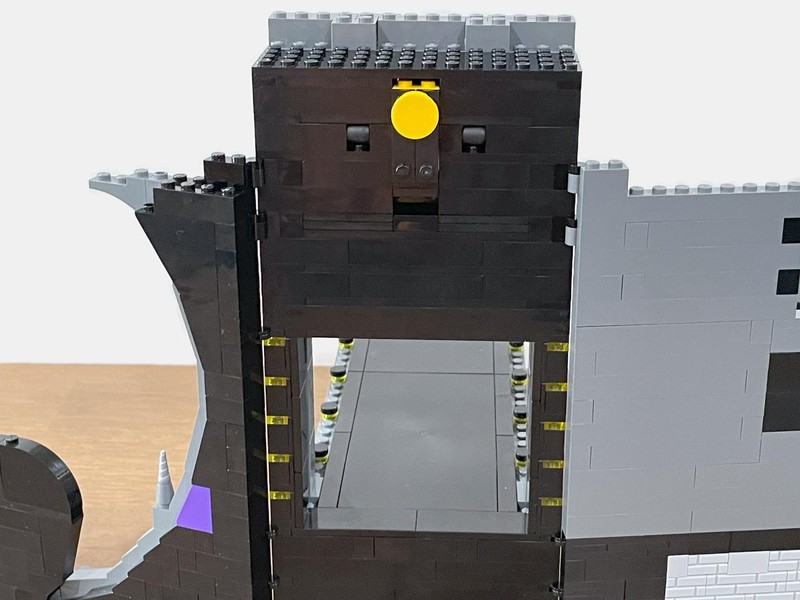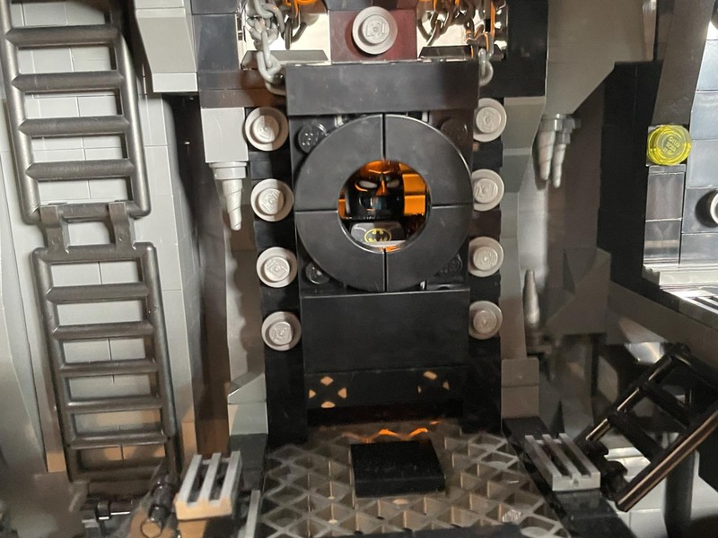And my questions are almost immediately answered. The door lifts up and is held in place by the mechanism. Pushing the yellow tile drops the door (with quite a bit of authority I will say). On the inside an ingenious bat-symbol is brick built.