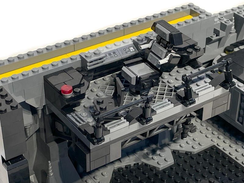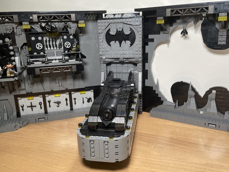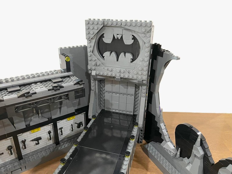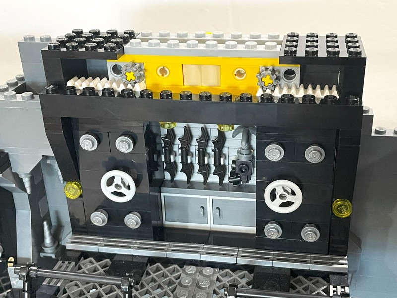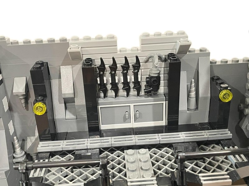 Going back to the back wall we finally give those other platforms a use. The middle one house the batsuit vault complete with knob-controlled drawbridge door. On the highest platform is the weapons locker, again with a knob on the back that opens the doors to reveal the goods.