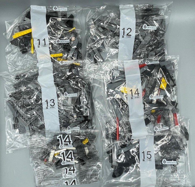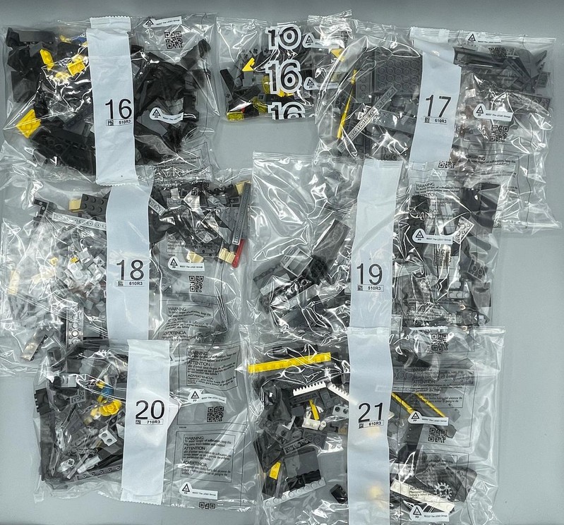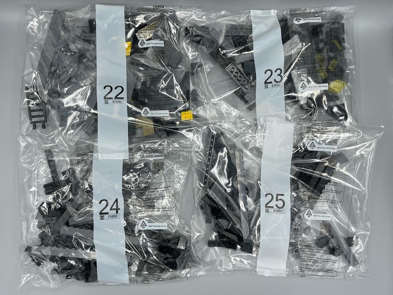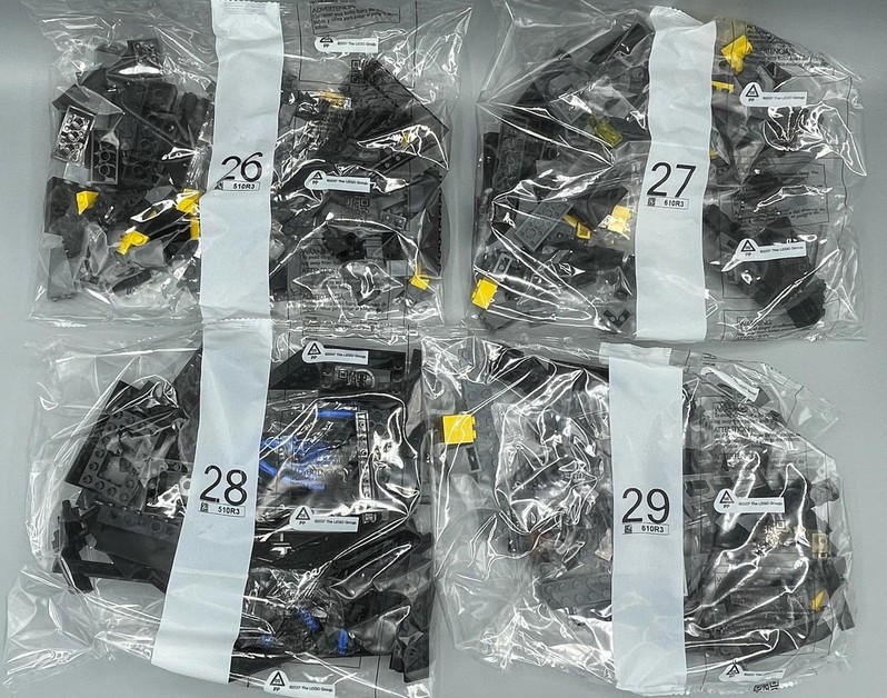 The box measured 520mm x 380mm x 260mm. Inside are 38 bags, 35 numbered 1 to 29, and 3 unnumbered, 1 loose part (New Roadplate 71772), 2 sticker sheets, and an instruction manual.