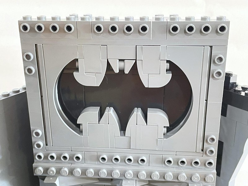 Moving attention to the front and side walls now. The front Bat-symbol shape is visible (you can thank my son for the random Dark Purple brick, he knocked the tray of parts and lost the Black one so we had to improvise). Above a large hole, presumable for the Batmobile entrance, is some kind of mechanism being built. Not clear yet how it will work exactly.