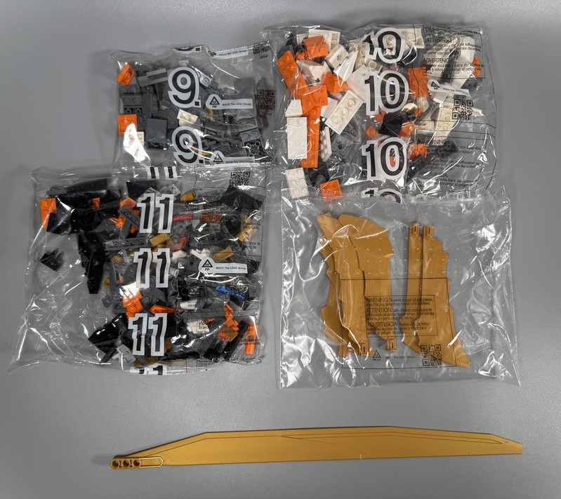 The box measured 350mm x 375mm x 65mm. Inside are 12 bags, 11 numbered 1 to 11 and 1 unnumbered, 1 loose part (5240), a sticker sheet, and 4 instruction manuals.