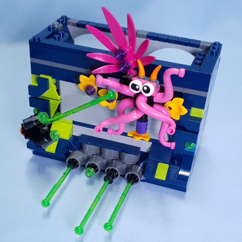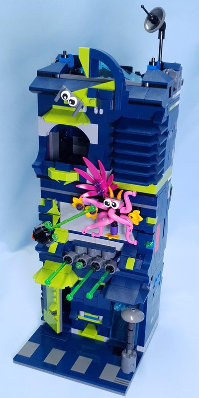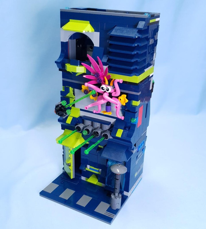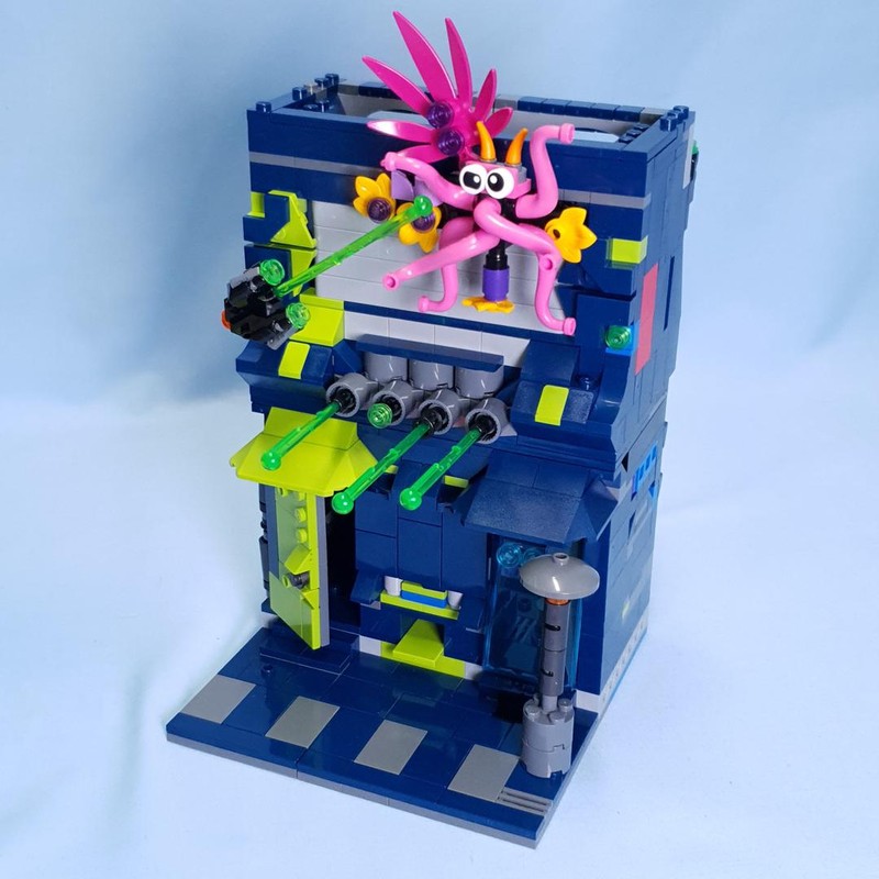 To finish this floor we build the most eye catching part of the build, the pink alien. This 6 tentacled monster looks great, and exactly the type of thing you would see on the front of an arcade. The small space ship taking a shot at it is a lovely touch as well. The sign is also mounted at a slight angle with a clever use of some technic parts.