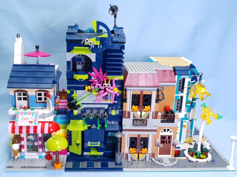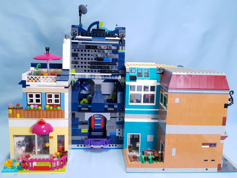 I don't have many modular sets assembled right now, and the ones I do have are a bit short (Birch Art & Antique Corner by Brick Artisan, and my own Friends Cafe Modular). Still, I think it looks great next to them. I'm actually a little annoyed because it is too tall for the shelf where I was displaying my modular buildings! sigh