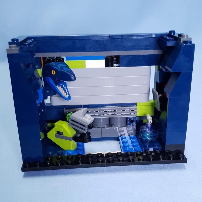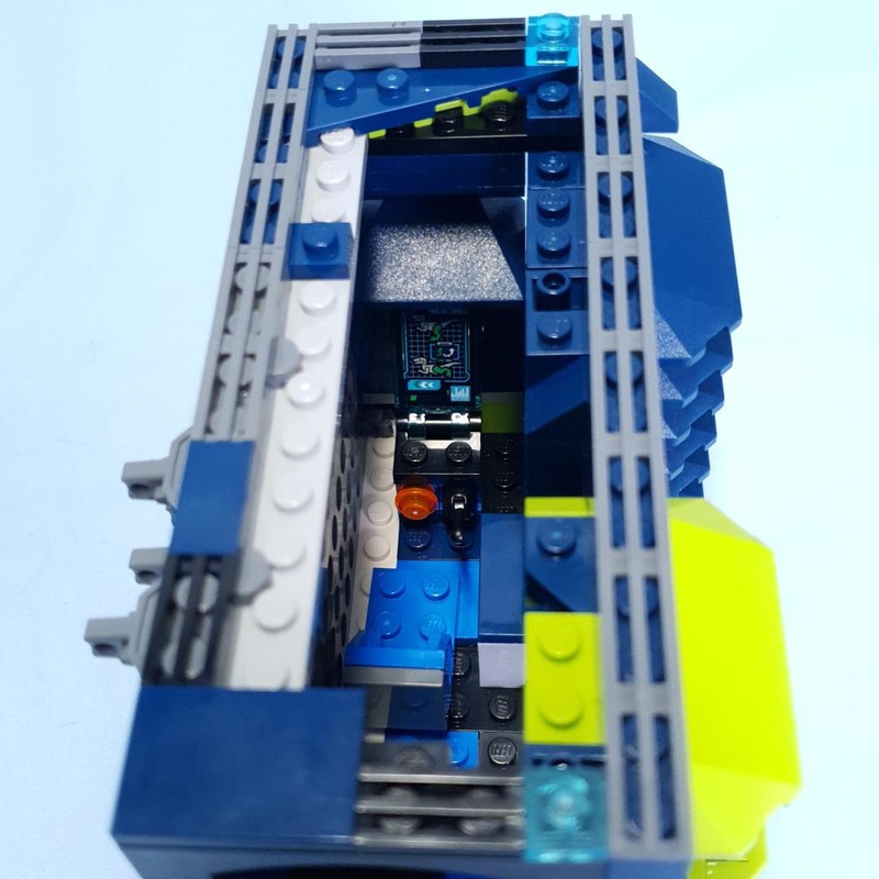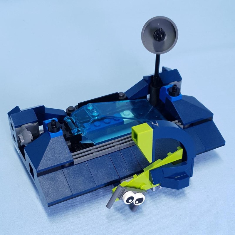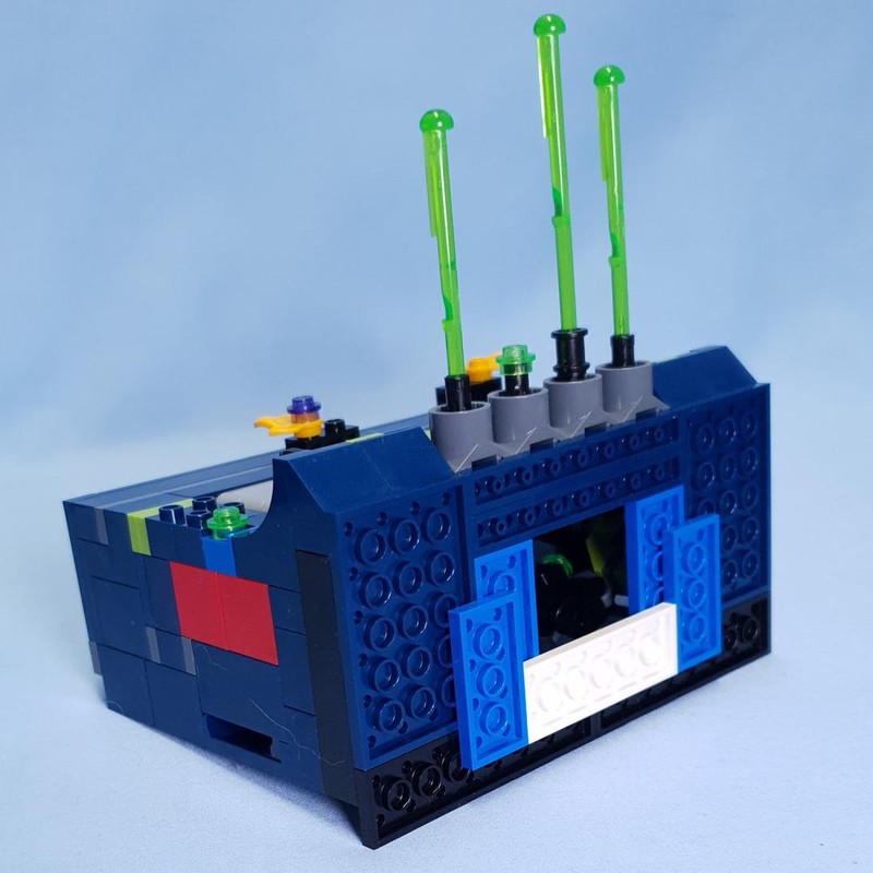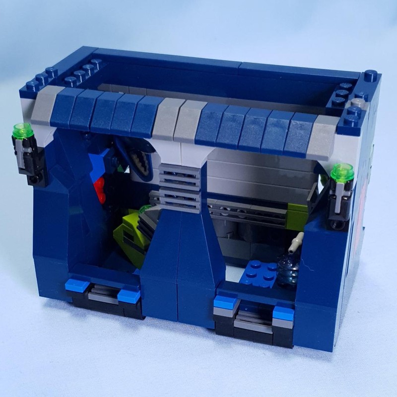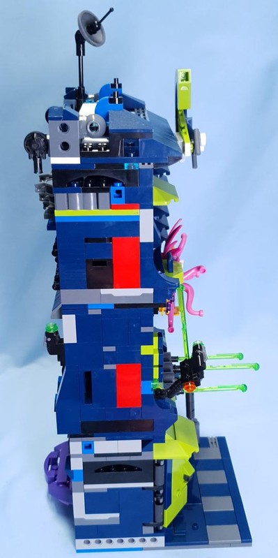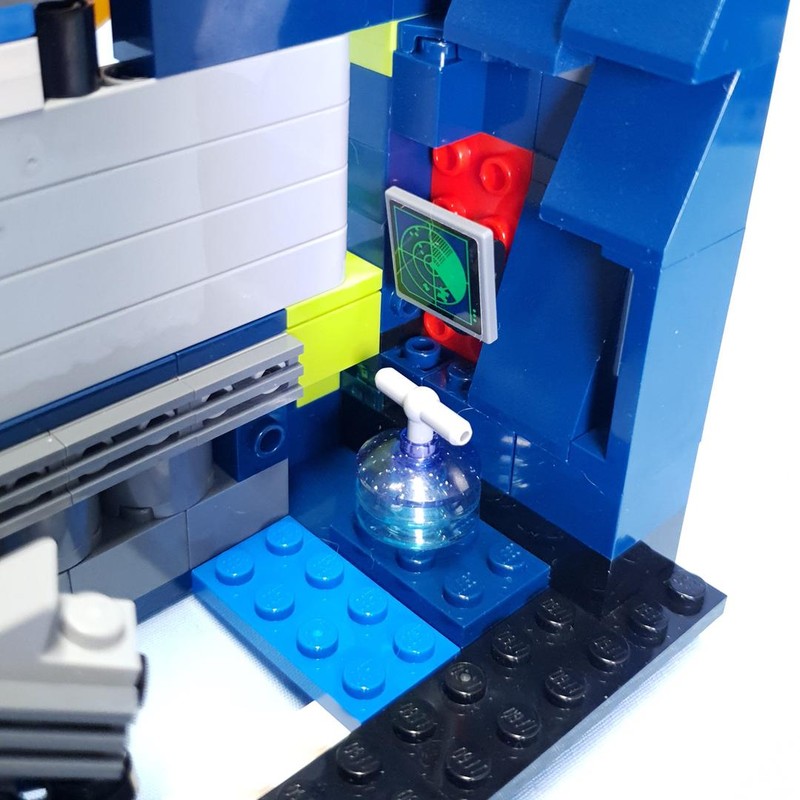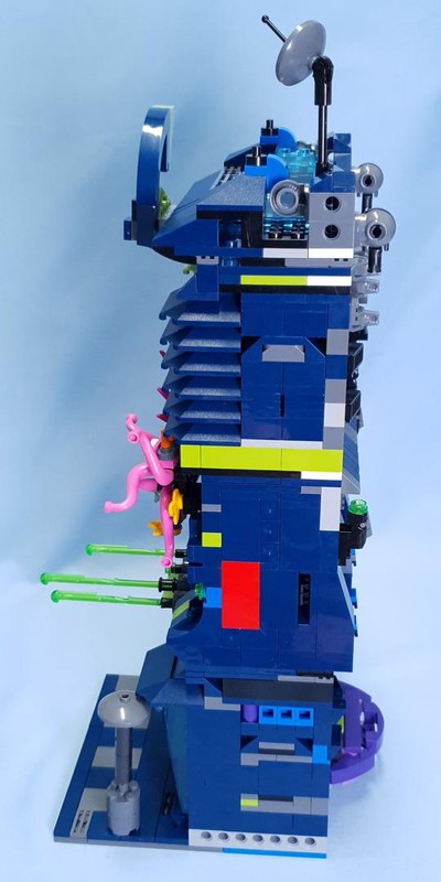 Finally we are up to the roof! The blue curved bricks are meant to be dark blue, again I don't know where these wandered off to. There is some lovely details with a skylight, satellite dish and another alien, this time looking like a scorpion. I also didn't have the right eyes, but any 1x1 white eyes look fine.