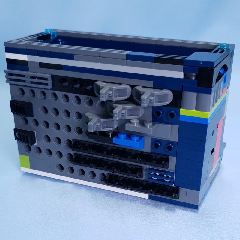 The front has a large stack of slope bricks which looks like louvers often used for mechanical plant.