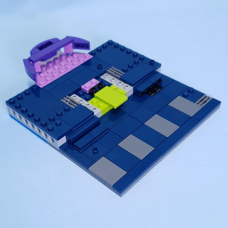 We start by assembling the base out of various plates. I did swap a couple of the dark blue tiles around to make it more sturdy. We next build a working drink machine, but no drinks for it? Canned drinks are part of the original set, so it is pretty easy to figure this out yourself. There is a ladder on the back side which lets you get to the upper floor.