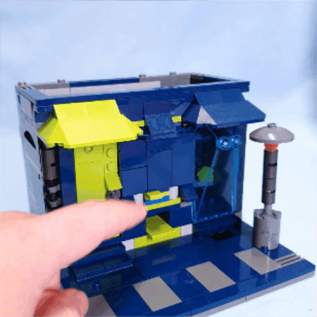 Oh, and I should probably check the vending machine works! It uses the same technique as the vending machine in Ninjago City Docks, and works great. Multiple cans can be loaded in and will pop out one at a time when a money tile or another 1x2 tile is inserted.