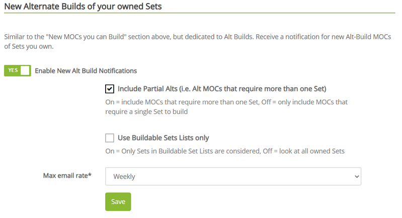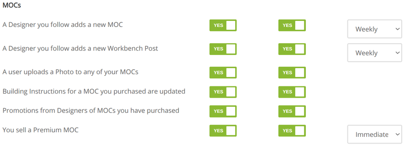 Added frequency settings for several notification types - Followed designers MOCs, Workbench posts, Sold MOCs, and added a Monthly option to the New MOCs you can Build email. So if you had previously disabled an email due to high volume you might consider re-enabling them.