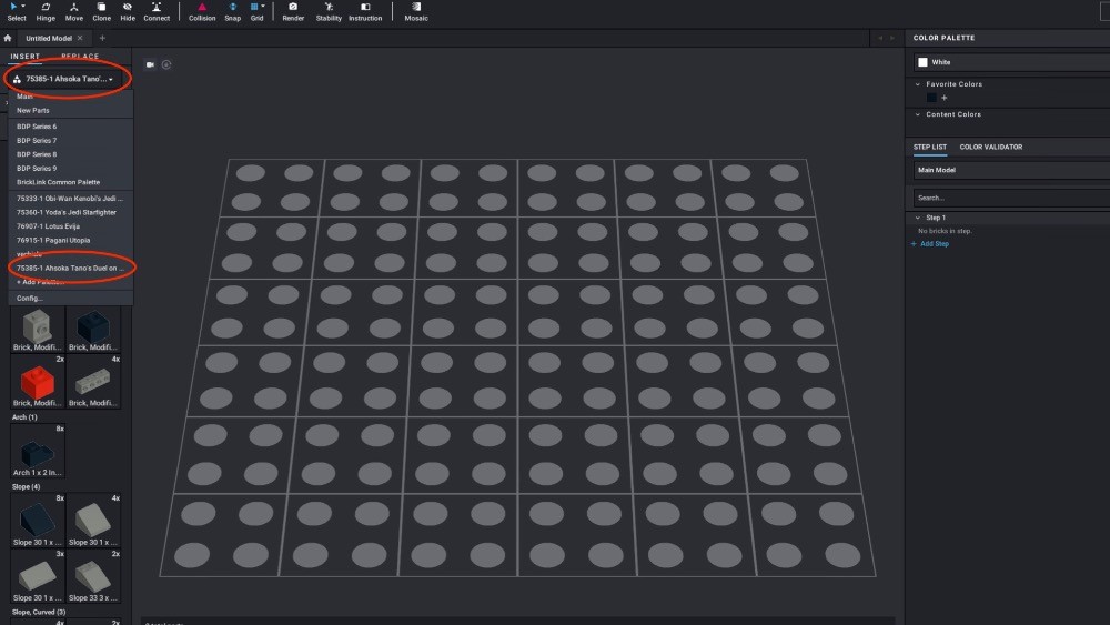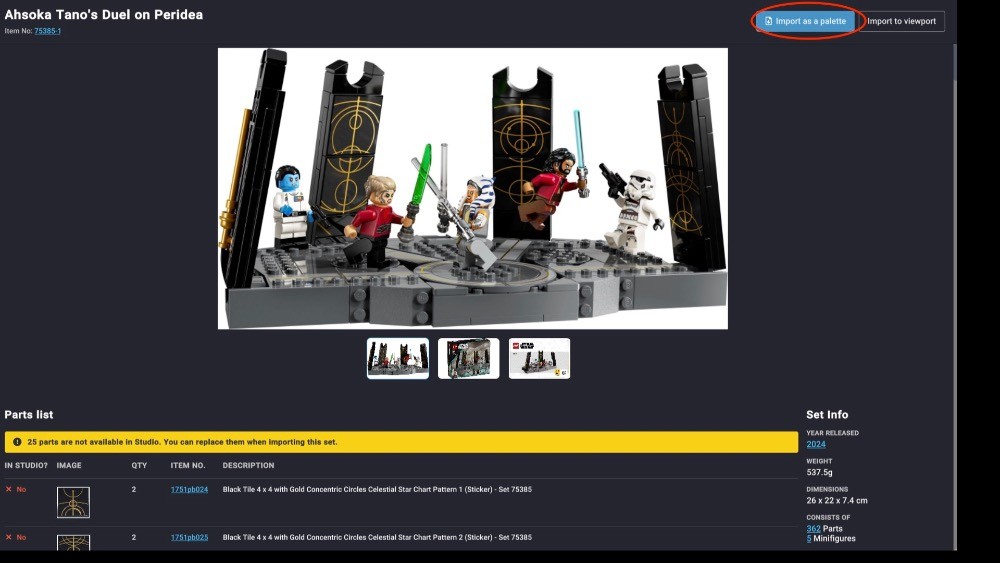 Import parts via palettes instead of the viewport. Until recently, I selected parts visually from the viewport. On one occasion where Studio didn’t yet have the parts list for a new set, I was forced to use the palette method. It was a game-changer. It taught me to remember the actual part names, made searching faster and made it easier to edit submodels—something you can’t do easily with viewport-selected parts.