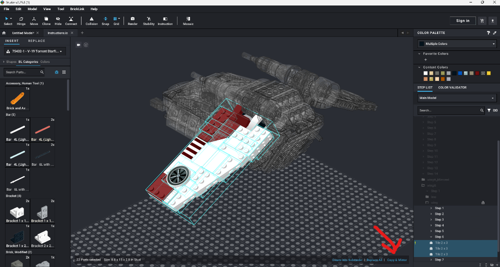 For the longest time I was using Studio as if it were just a digital version of building LEGO in real life — no smarts, just a way to spit out instructions (since I don’t design in Studio either). The mirror tool felt like one of those “hidden in plain sight” features… once you find it, you can’t imagine ever going back. All those hours spent painstakingly rebuilding wings and sections brick by brick — feels like the digital dark ages!