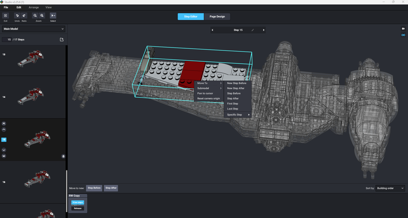 I use the “Step Editor” in reverse—adding “new step after”, and don’t leave instructions until the last moment. I create steps after the completion of each submodel. As I am doing the Studio model I go through at least one round of internal cleanup and optimization, then do another round of cleanups as I complete the “Page Design”. Many of my models get version updates (v1.1, v2.0, etc.) because I always come back to tweak tiny things no one else might notice—but I do.