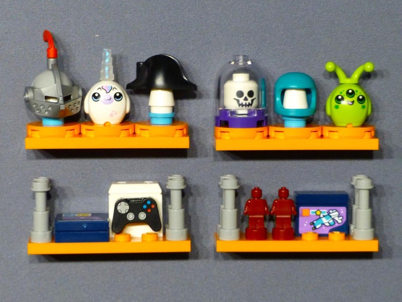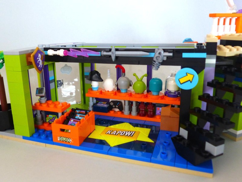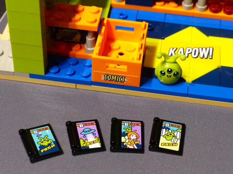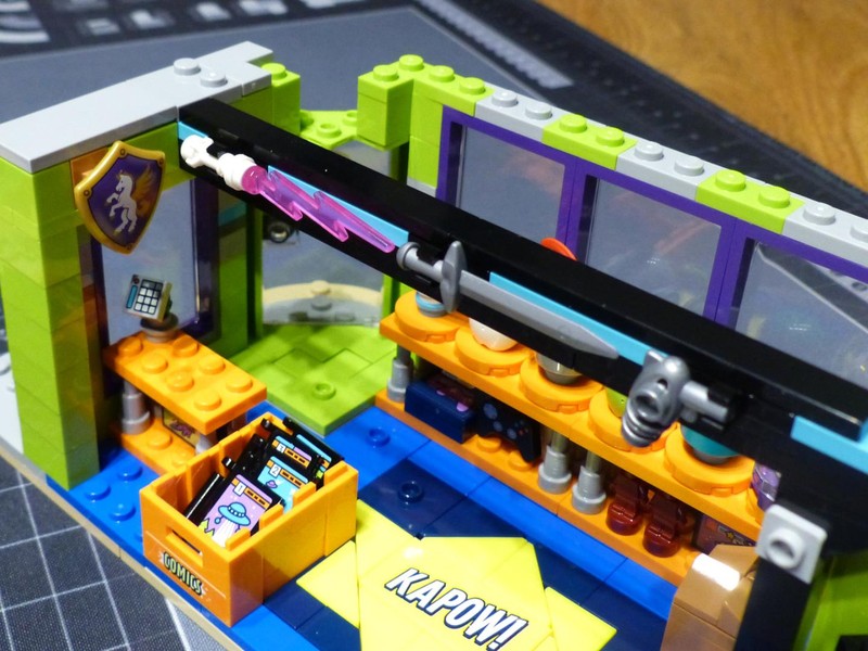 Next is the store's inventory. This store has everything you want in such a store. Of course, comic books, game controller, (collector's) figures, dolls (matching with the comic books and the window prints, we'll see later), costume items, and fan memorabilia. I'm sure that some of you have already spotted the most interesting items for Lego collector's: the classic space helmet in dark turquoise (appears also in this year's 21358 Vending Machine with a complete classic spacemen) and the shield with Pegasus print. The stickers on the boxes on the bottom shelves resemble two Lego sets: the dragon from 41178 and set 5974 - Galatic Enforcer. While filling the store, it immediately reminded me of the comic book store from The Big Bang Theory, especially the box with comic books to browse through.