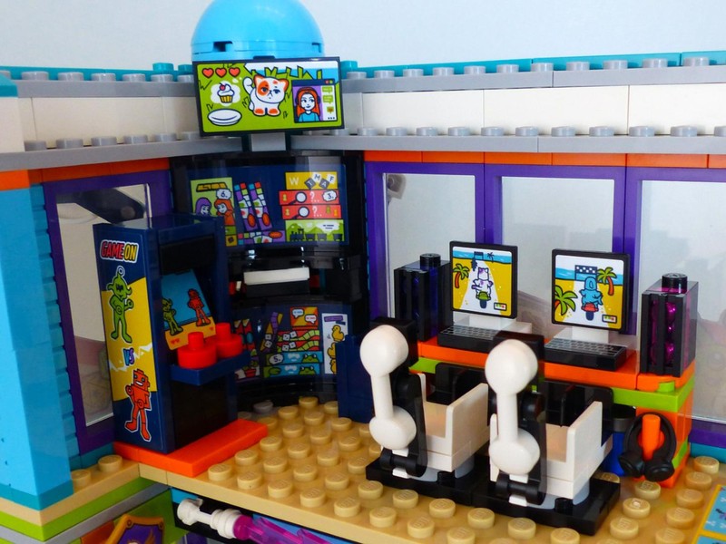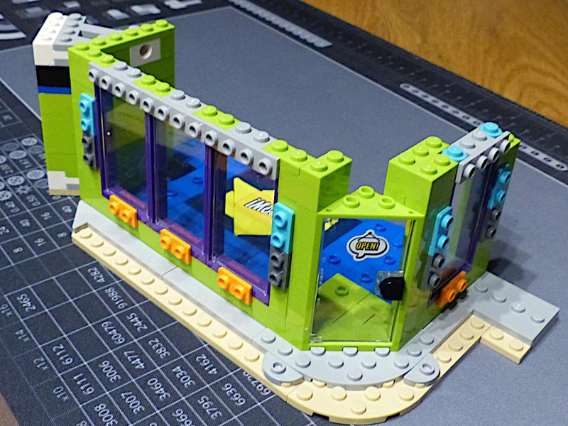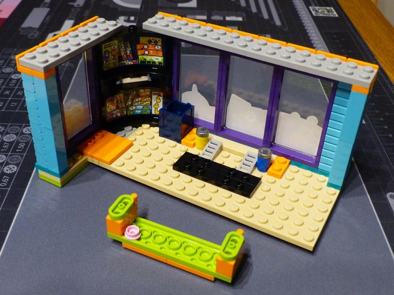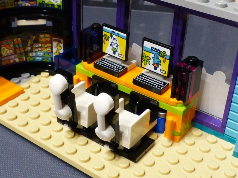 Now up to the gaming section of the store on the upper floor. When building the walls (with masonry bricks in a new color, by the way) you encounter one nightmare of sticker applying: the inside of the 4x4 quarter zylinder. But after that, the gaming station with two gaming computers and two a bit odd-looking gaming chairs. There are drinking cans for the gamers, even crushed ones in the bin next to the station. Also, someone left his/her chewing gum under the table.