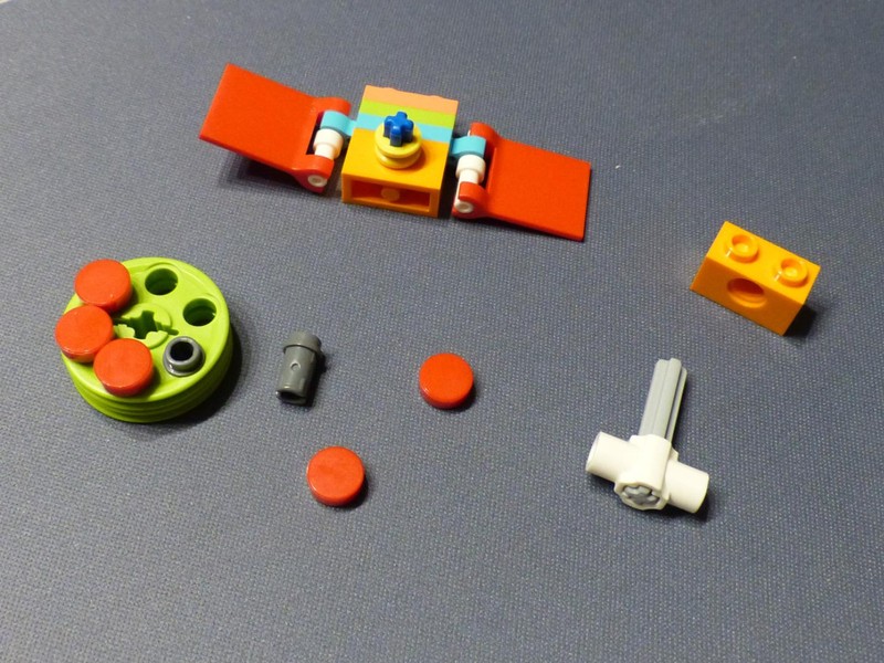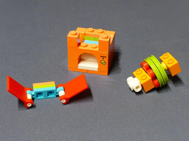 We start with the vending machine that has a little play feature. A simple but clever turning mechanism with a belt wheel can spill out a small toy (in form of 1x1 round tiles). The backside uses an axle pin to create enough friction to hold the wheel in position to prevent tiles from falling out accidentally. Two flags cover the side to give the wheel space to turn freely and keep the width at 4 studs.