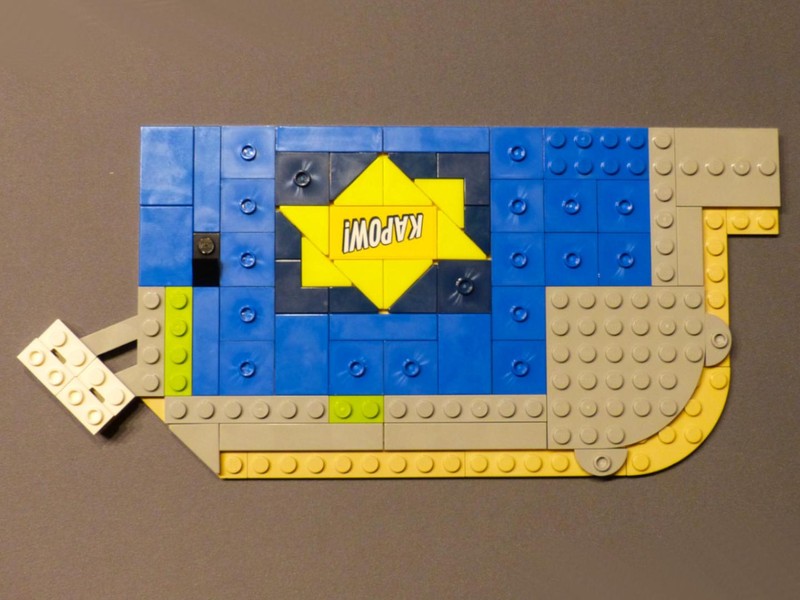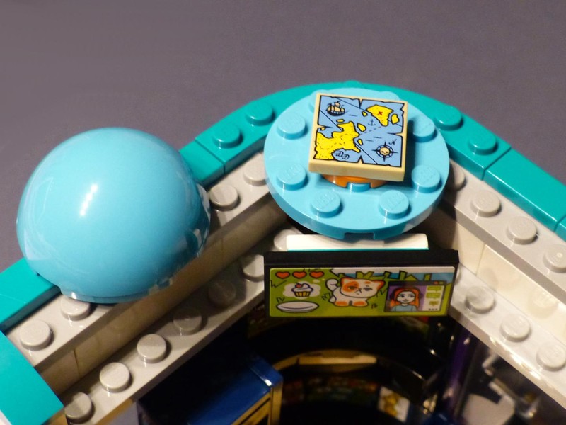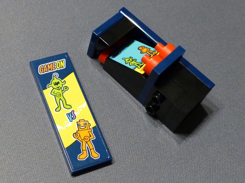 The vintage gaming machine with a 'Street Fighter'- like fighting game is really cool. A bit of SNOT and a 180° stud turn on the top side achieve an accurate form of such a machine. The last bit is a hidden map inside the hemisphere, of which I can't make any sense.