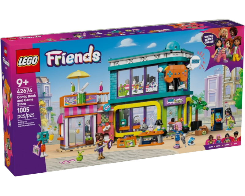 A building set for young heroes – This Comic Book \u0026 Game Store for girls and boys aged 9 and up comes with 4 minidolls, alien and unicorn plushie-style LEGO® pieces and accessoriesIncludes 4 minidolls – The characters come with special comic-book-inspired costumes, including a robot, superhero, galactic explorer and a knight, plus accessories to fuel creative playToy vending machine – The set is packed with features, like the toy vending machine that dispenses cute little toy tiles, an arcade machine, a gaming area, retro-themed décor and a slush ice storeHeaps of accessories – Includes lots of role-play inspiration, such as comic books, costume helmets, game controllers and headsets, slushies, a store mascot, TV screen, a trash can and moreA gift for kids – This fun toy makes a great gift for kids who love superhero stories, comic books or building sets that they can play with while creating their own adventuresOnline show – Inspire more creative-play ideas with other sets (sold separately) and the LEGO® Friends: The Next Chapter online show, where kids can get to know the characters of Heartlake CityA helping hand – Discover intuitive instructions in the LEGO® Builder app, where builders can zoom in and rotate models in 3D, track their progress and save sets as they develop new skillsMeasurements – 1,005-piece set with a main model measuring over 7 in. (18 cm) high, 11.5 in. (30 cm) wide and 7 in. (17 cm) deep