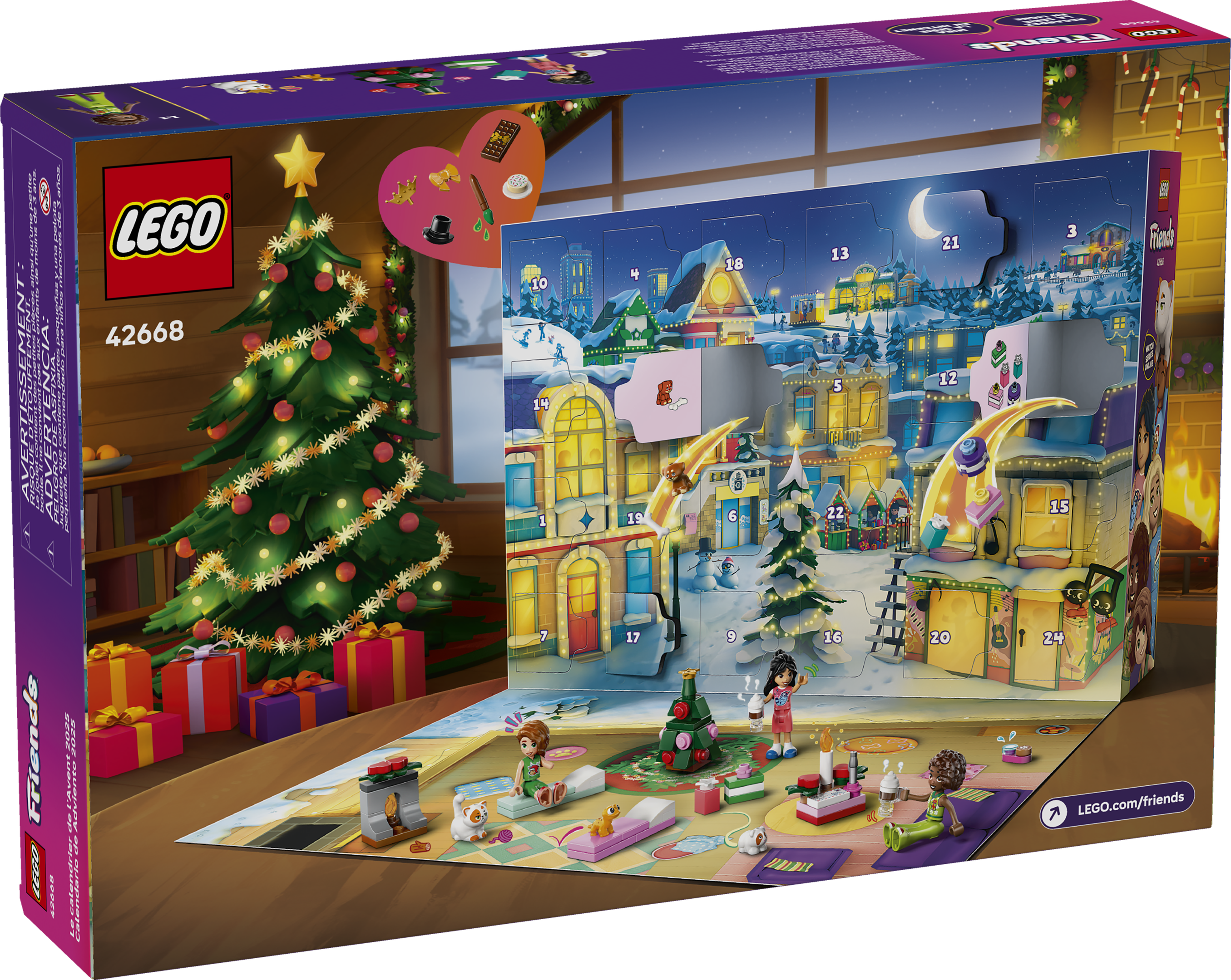 Inspire holiday cheer and cozy moments for girls and boys aged 6 and up as kids open the doors of the LEGO® Friends Advent Calendar 2025 (42668) toy building set. It comes with 5 minidolls, including Aliya, Autumn, Liann, Nova and Leo, plus 5 LEGOanimals including 2 dogs, a guinea pig, a gecko and a cat figure. Open a door each day to build the holiday sleepover story. Find surprises behind each door with sweet Christmas builds to make. Discover festive activities, like writing to Santa, decorating the tree, singing karaoke, riding the hobbyhorse and making hot chocolate. Each minidoll comes with a mattress and each pet has accessories so kids can create different stories as they assemble the scene. Other fun accessories include a sofa,lamp, fireplace, sled, 5 gift boxes and a LEGO-piece reindeer plushie. As well as being a holiday countdown gift for kids, this creative toy supports young builders’ social skills as they join the friends for an unforgettable sleepover. From LEGO.com