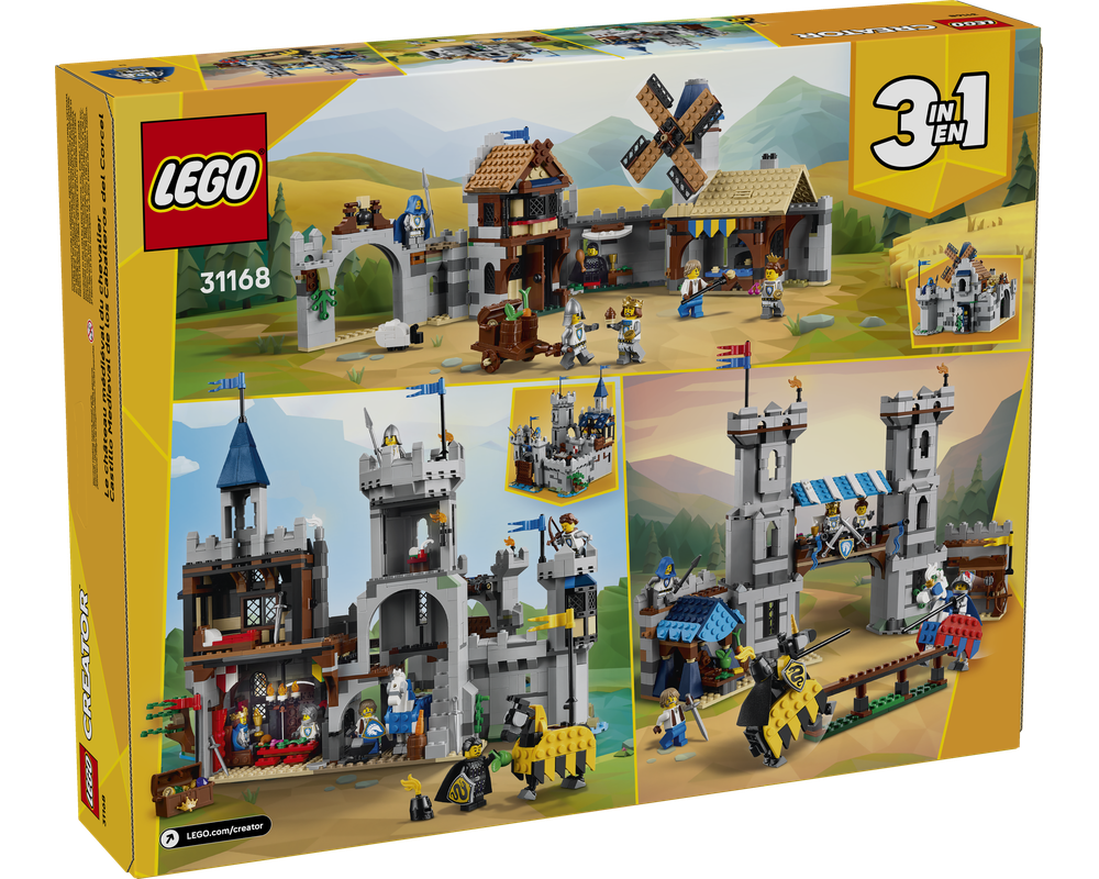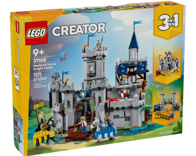 3 medieval toy building options in 1 box – The LEGO® Creator 3in1 Medieval Horse Knight Castle playset building toy lets kids build and rebuild 3 different detailed models using the same bricks Endless play options – Kids can role-play action-packed stories with 3 different medieval toys (models cannot be built simultaneously): a castle playset, jousting set or a town playset Packed with features – Medieval castle opens at the back and features a movable drawbridge, great hall, stable, smithy, secret treasure chest, the king’s bedroom and 2 tower terraces 6 minifigures – LEGO® set comes with 6 medieval characters: horse knight king, horse knight champion, horse knight archer, horse knight spearman, blacksmith and serpent knight, plus 2 posable horses Fun medieval gift for kids – 3in1 toy provides an immersive build-and-play experience for kids with a passion for dreaming up medieval stories, who can then display the models in their rooms A fun way to build – Let the LEGO® Builder app guide kids on an intuitive creative adventure as they save sets, track progress and zoom in and rotate models in 3D while they build LEGO® Creator toys – The 3in1 transforming toy sets in the range (sold separately) let kids build 3 different models inspired by some of their biggest passions, including animals, vehicles and houses Measurements – This 1,371-piece LEGO® 3in1 building set features a medieval castle measuring over 12 in. (31 cm) high, 14 in. (36 cm) wide and 11.5 in. (30 cm) deep