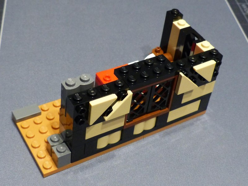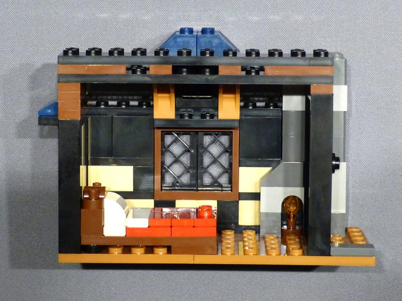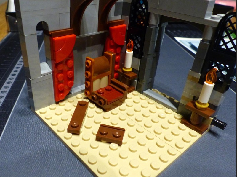 The last bit are the living quarters (so-called palas) in the second tower. The walls have a half-timbered look but not with such an advanced buildling technique like the Tudor Corner. Here we use SNOT bricks and tiles with spaces and yet, the optic effect works, too. The sparce inside has a bed and a small fireplace.