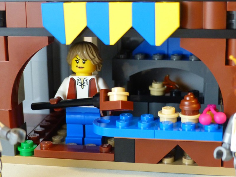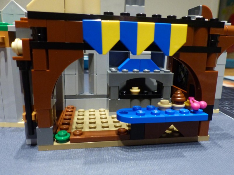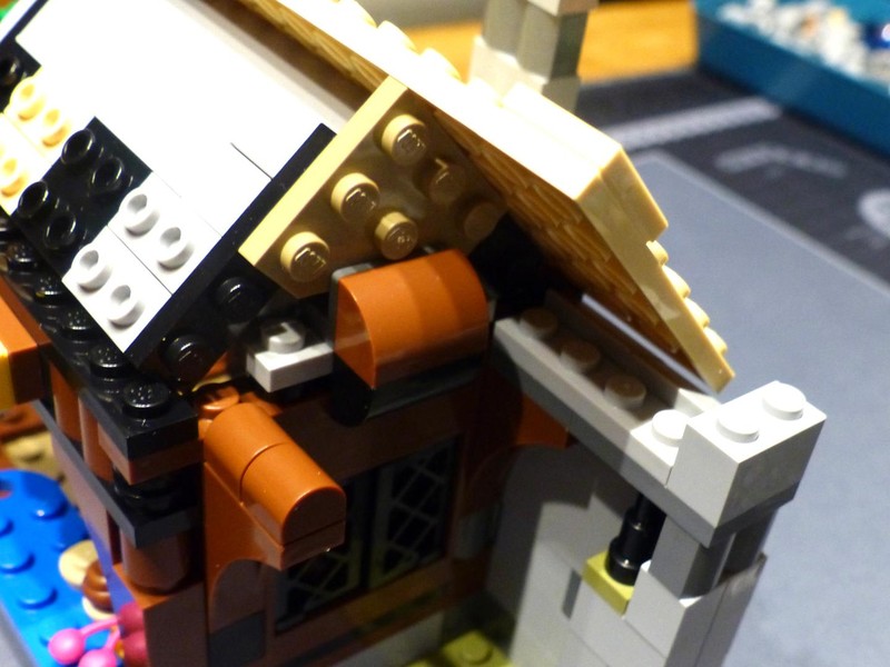 The most interesting building is the bakery with an oven and sales counter. Its roof is again well built. It doesn't connect but just rests on top of the building. Yet, the spacing is absolutely perfect, and a bracket creates enough friction to securely hold it in place.
