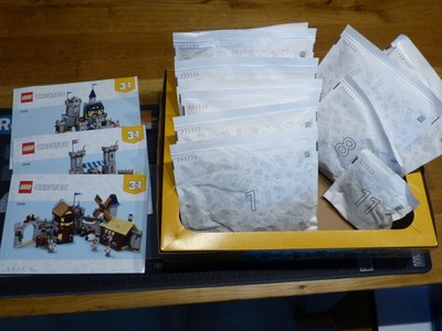 The instruction manuals all measure 270 mm x 193 mm. The first one (main model) has 255 pages and 396 building steps; the second one (knights tournament) has 139 pages with 248 building steps and the third one (village) has 224 buildings steps on 135 pages.