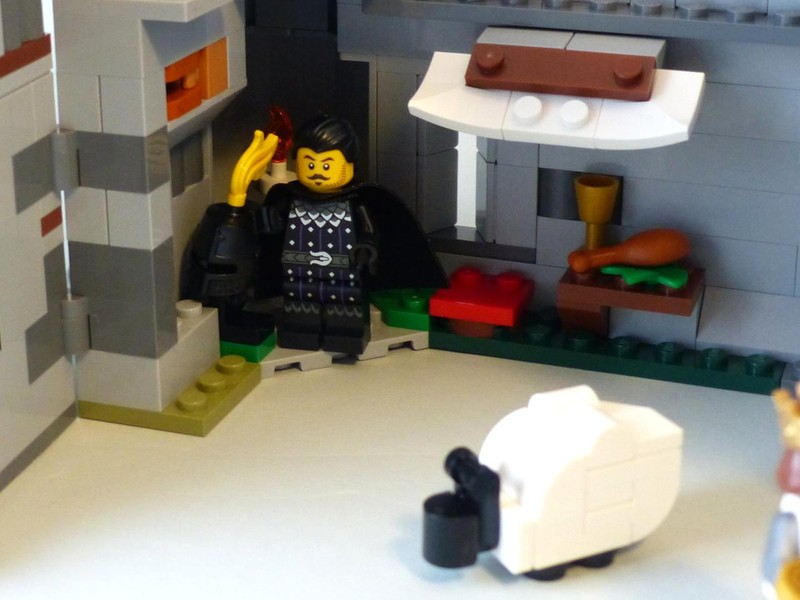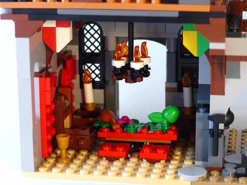 The king's galery in-between the towers is quite pompous. The most interesting buildling technique is found in the little tavern. The angle for the roof is achieved with SNOT: a wedge brick sits in a 45°-angle on a bracket with jumper plate and also lies on the plates at the side perfectly.