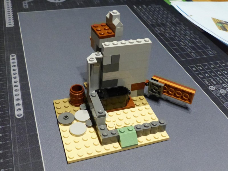 The third model is a small village with a windmill. We built alongside the walls, starting with a gate and a bell on top, probably to warn the people if raiders appeared. A kettle as bell is a really fun NPU, and thanks to the 1/2 pin without friction ridges, the bell can actually be swung back and forth. The buildings are quite small with sparse interior. The hinge bricks allow you to arrange and angle the setting of the village pretty much to your liking.