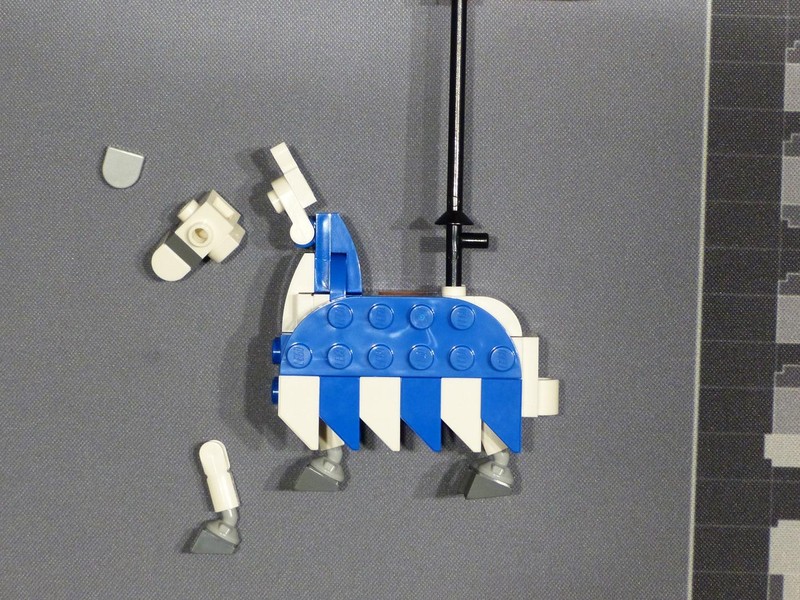 Next are the two horses of the set. As you can see, they are brick-built instead of a single mold. As far as I've heard, this is quite an ambivalent topic for fans, and we're going to address this later, but for now we focus on the build. The designer used mostly SNOT techniques with brackets to hide the clips and the saddle space for the Minifig. The also brick-built barding is needed to securely hold all sections together.