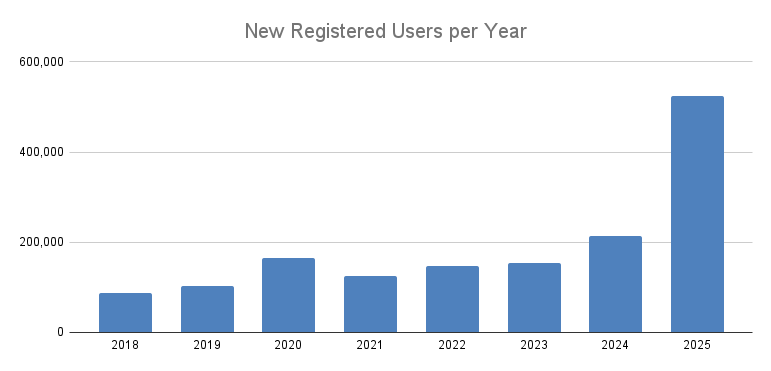 We have a total of 1,600,000 registered accounts of which 500,000 joined in 2025. The reason for the huge jump is almost entirely due to some changes we made to require login to access certain features - eg downloading free MOC files. In almost every case, this change was due to bot traffic getting out of hand.