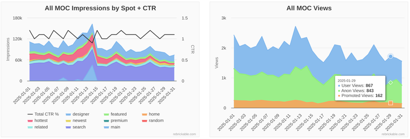 Now, although the impressions are distributed evenly amongst participating designers, there is an exception for search results. We always make sure the search results are specific to the search terms, so if your MOCs are ranking well for common search terms they will be shown in the search result featured spots (front of search results) more often. Be sure to look at your Designer Dashboard > Search Stats page to see what terms you are ranking for to take advantage of this.