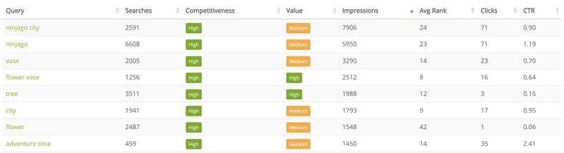 Also access the Search Stats page of your dashboard which allows you to see which search queries are being used to find your MOCs and how well they convert. Alternatively, click on a specific search term to see which of your MOCs are ranking for that term. You can also see which search queries are the most popular on Rebrickable for a time period. Allowing you to target high value/low competitiveness terms if you want ideas for new MOCs!