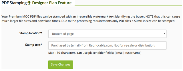 If you have PDF files for your Premium MOCs, you can enable PDF Stamping which adds a semi-transparent watermark to every page. This is used to identify the buyer of the MOC in an attempt to reduce piracy, or at least be able to identify it's source if it happens. Under Account > Settings > Premium MOCs: